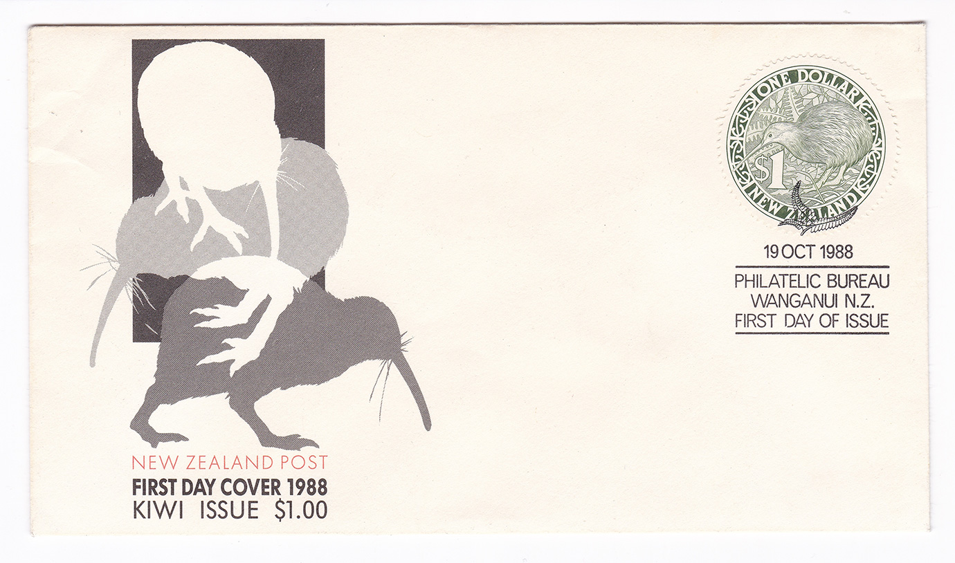 Allan Mitchell, 1988 $1 Definitive Stamp Issue (Kiwi Issue First Day Cover) (1988), Paper Envelope for New Zealand Post Philatelic (cancelled with silver fern), 9cm x 16cm with 3cm dia. Stamp, Edition Unknown