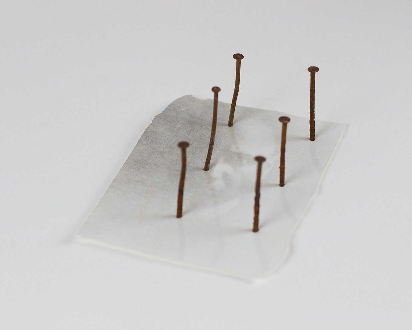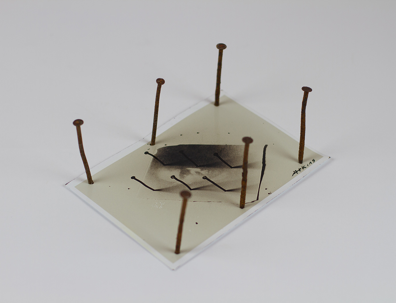 Marc Atkins, Unsure Day 135b (2009), Print on Photographic Paper with Six Nail Holes, Six Rusty Nails (signed by the artist), 12.5cm x 18cm (£180)