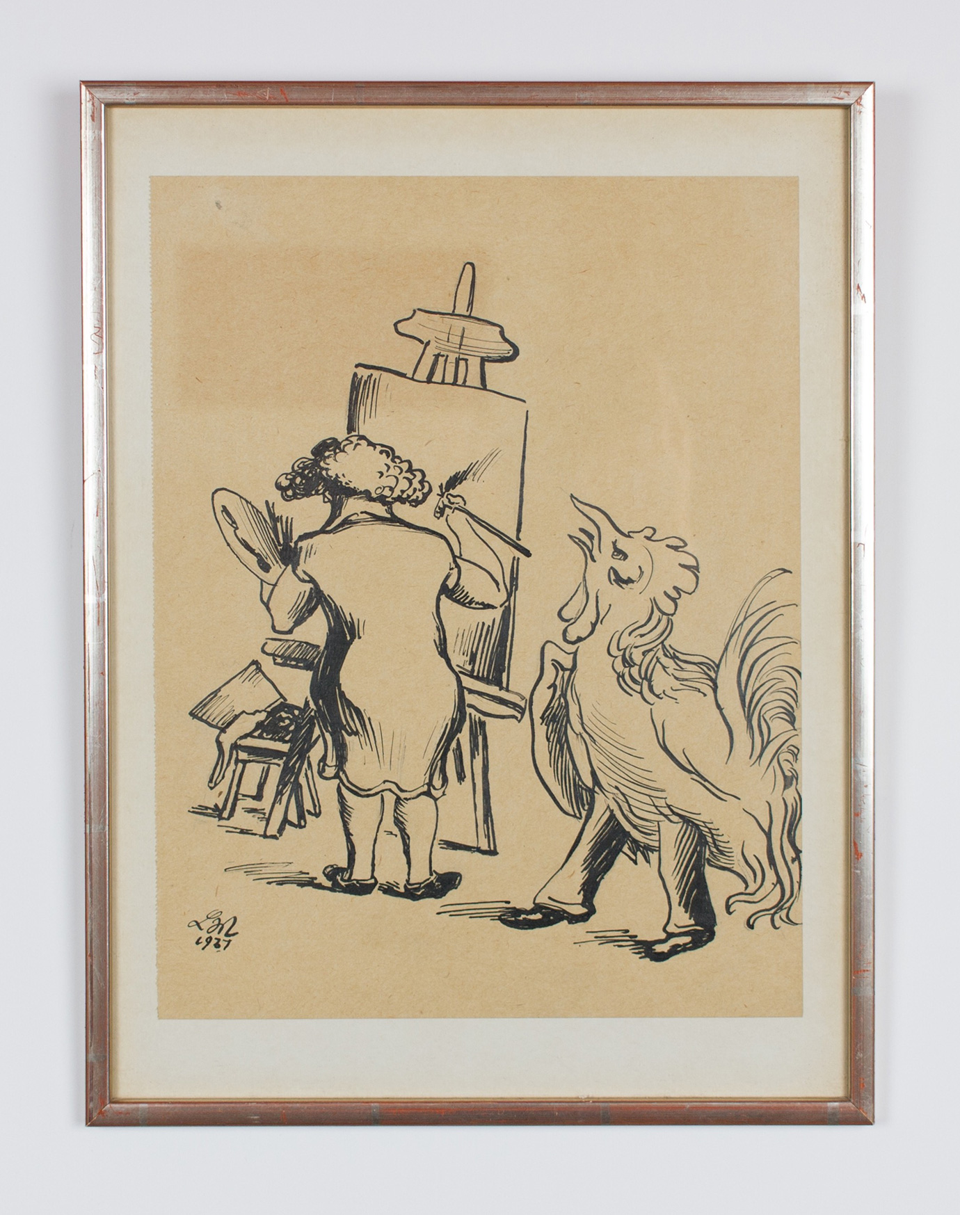 Ludwig Meidner, Else Meidner at Easel (1937), Watched by the Artist as a Cockerel, Ink on Cartridge Pad Paper (initialled and dated by the artist), 33cm x 26cm, Unique