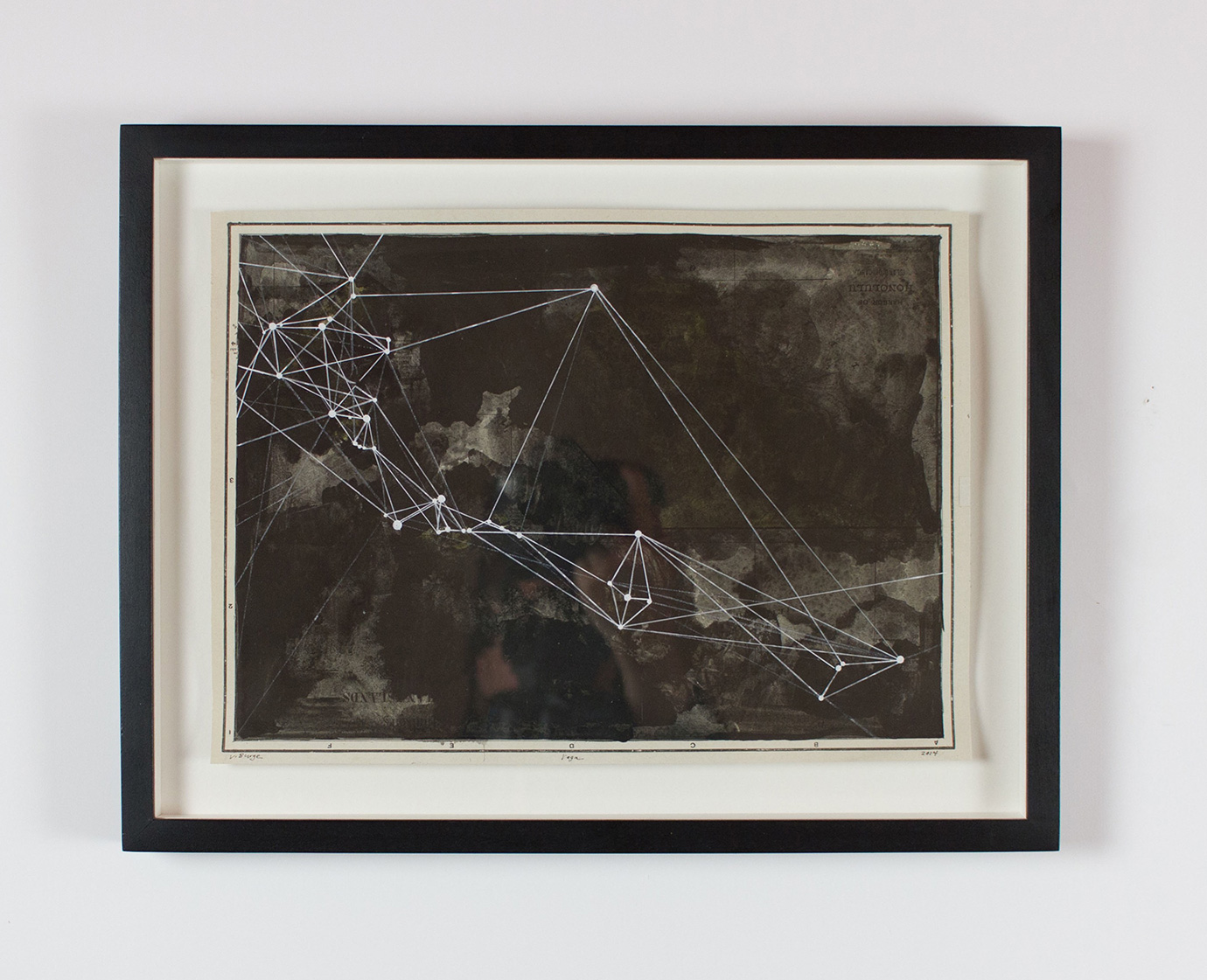 victoria burge, vega (study) (2014), ink on 19c map (cram’s atlas) (signed, titled and dated by the artist), 25.5cm x 34cm, unique (subsequently reproduced as photopolymer intaglio in an edition of 15) £2400