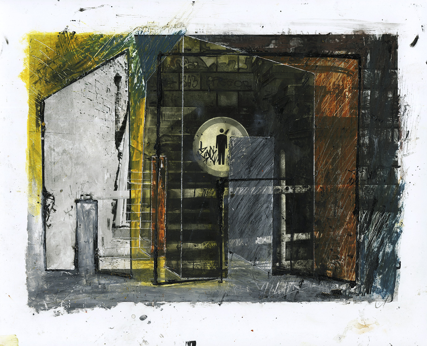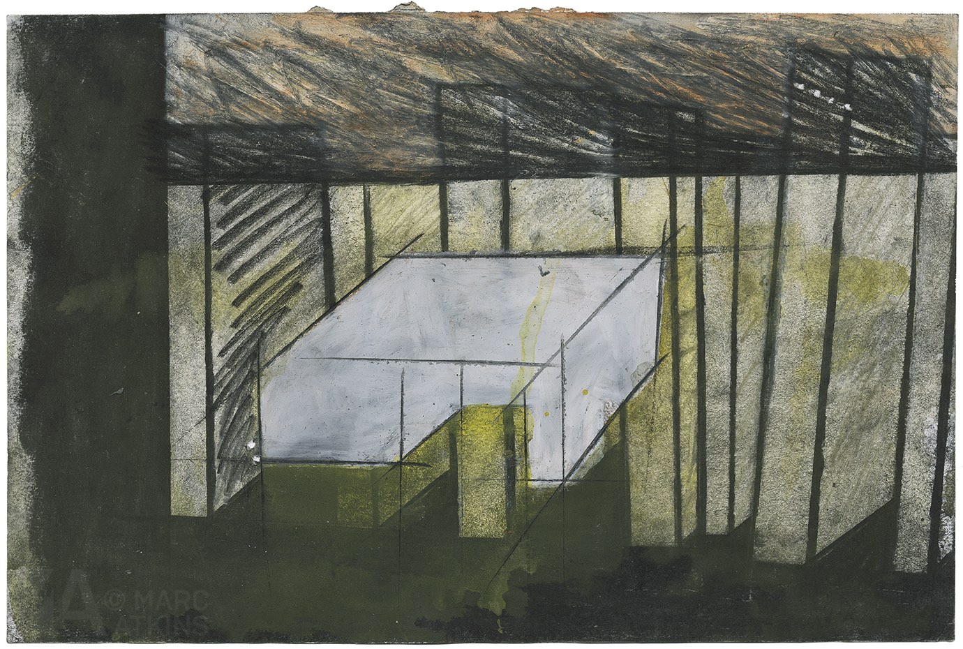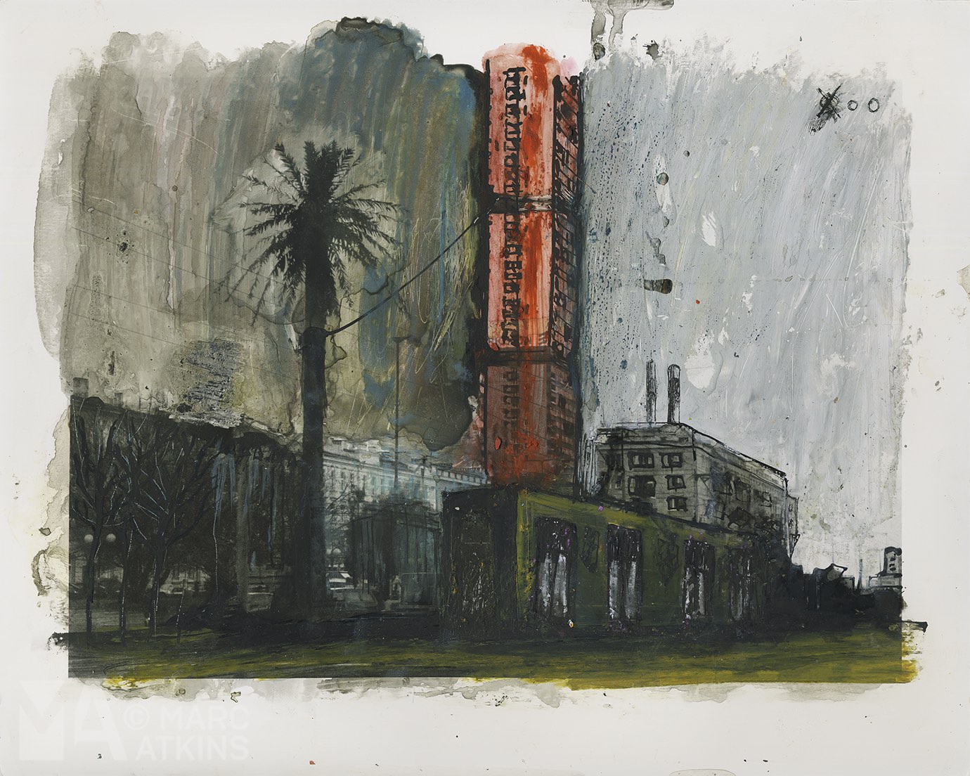 Marc Atkins, Table Building #645 (2017), Pastel, pencil, charcoal, watercolour paint on watercolour paper (signed by the artist), 21.5cm x 28cm (Unique)