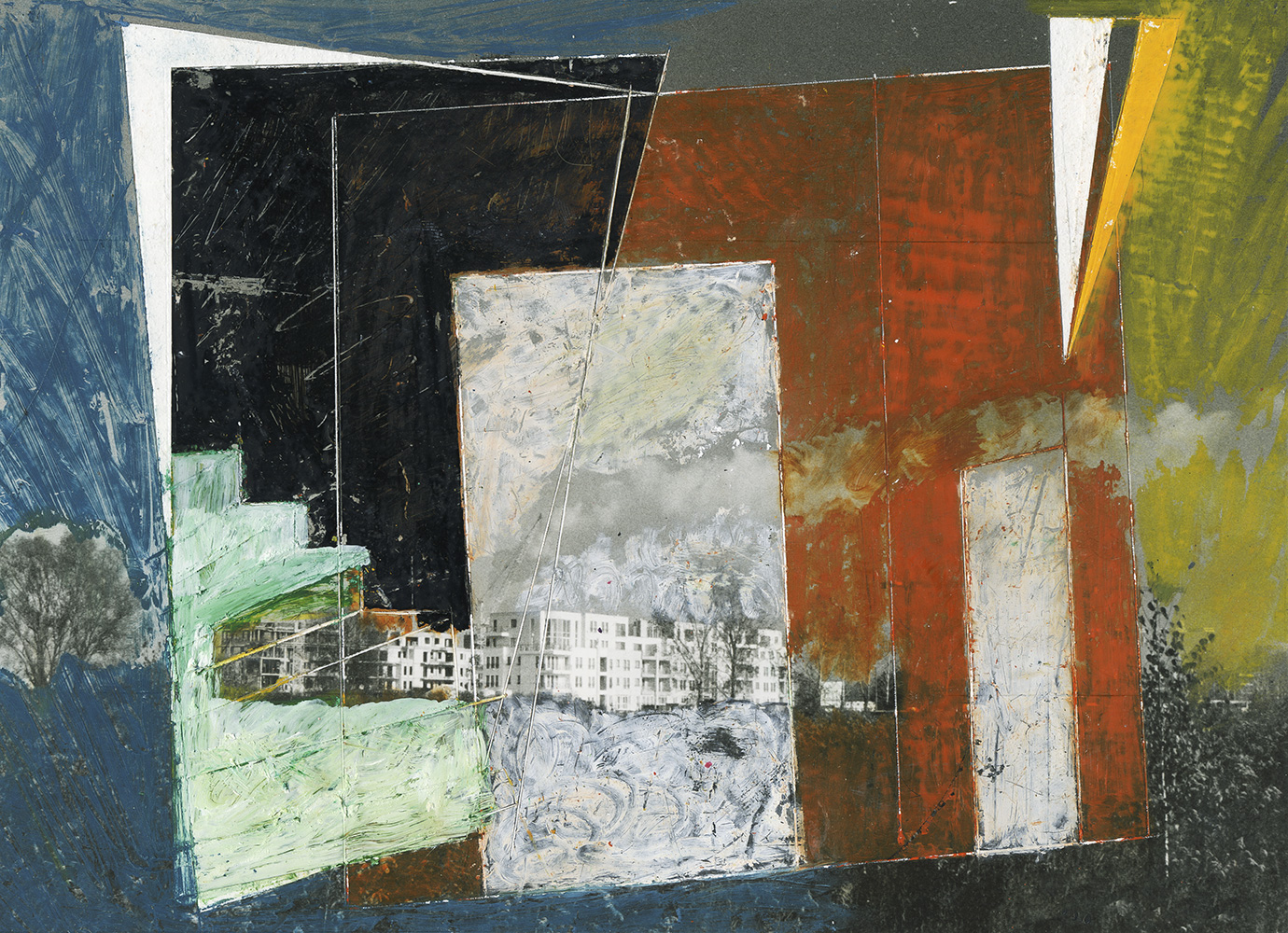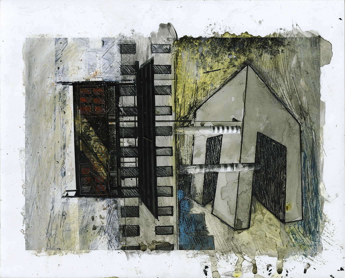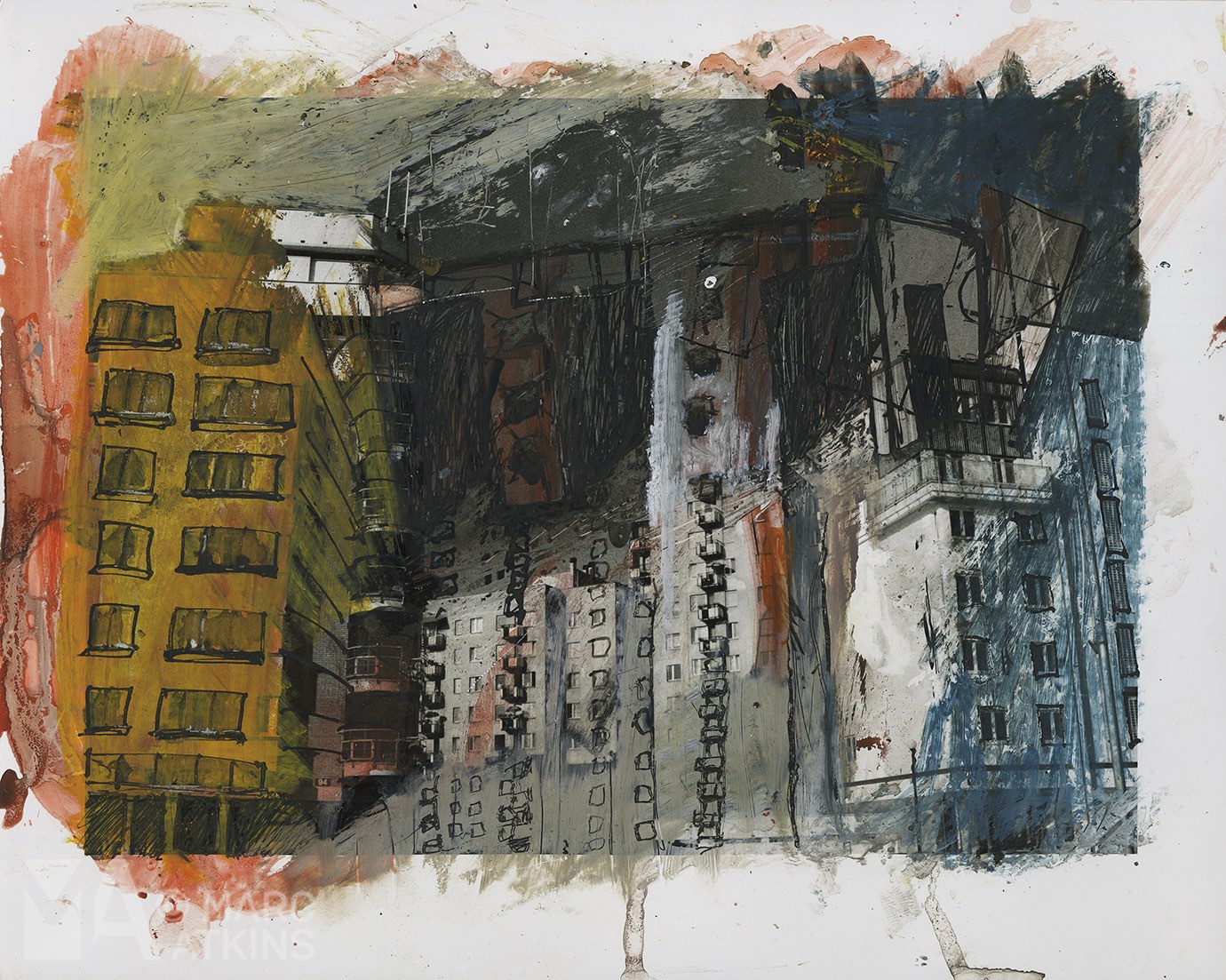Marc Atkins, Table Building #425 (2017), Pastel, pencil, charcoal, Conté crayon, wax crayon watercolour paint on watercolour paper (signed by the artist), 21.5cm x 28cm (unique)