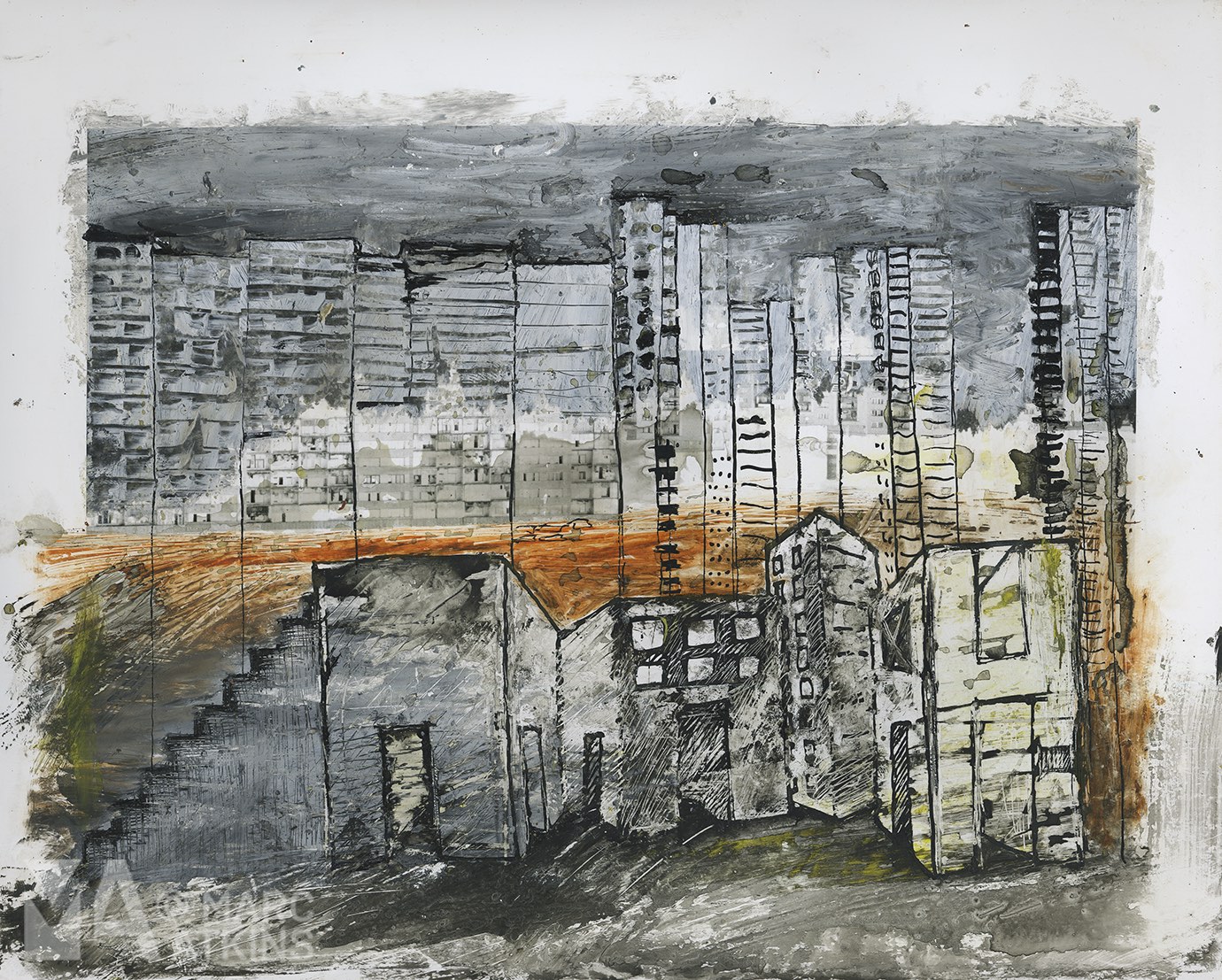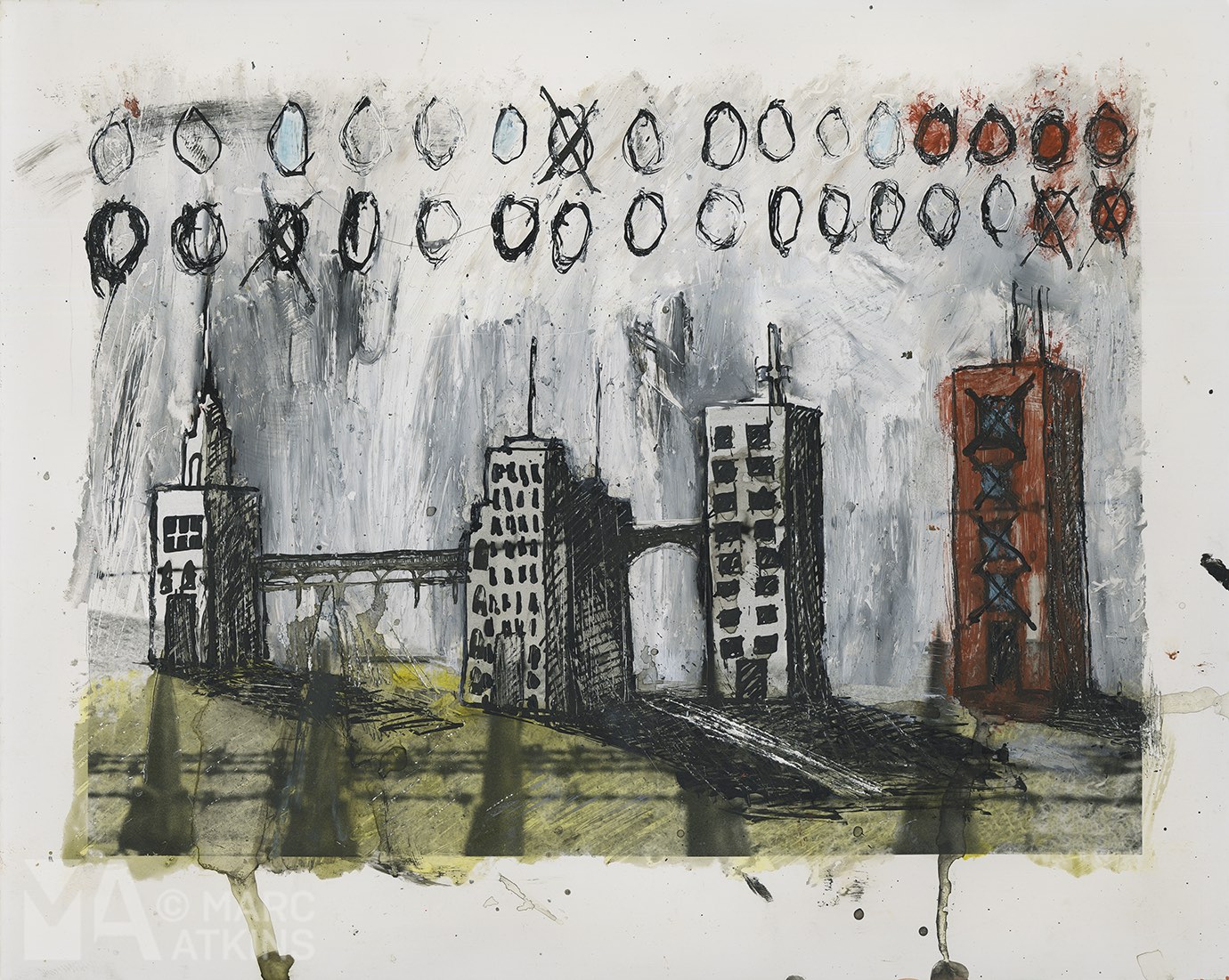 Marc Atkins, Table Building #442 (2017), Pastel, pencil, charcoal, Conté crayon, wax crayon ink, watercolour paint on watercolour paper (signed by the artist), 23cm x 29.3cm (unique)