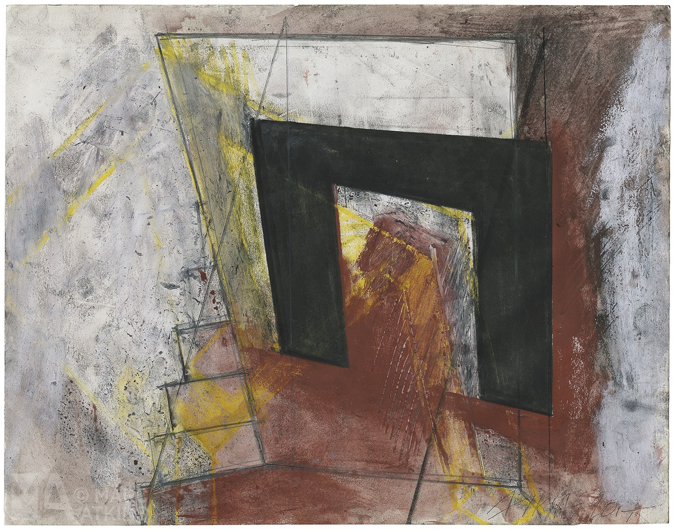 Marc Atkins, Table Building #443 (2017), Pastel, pencil, charcoal, Conté crayon, wax crayon, watercolour paint on watercolour paper (signed by the artist), 23cm x 29.3cm (unique)