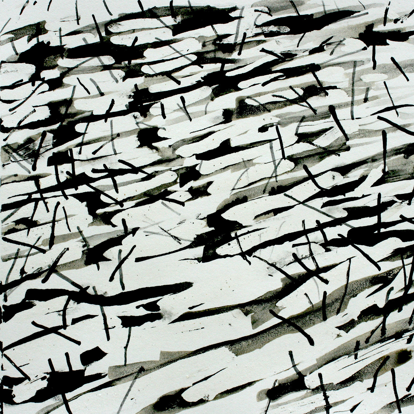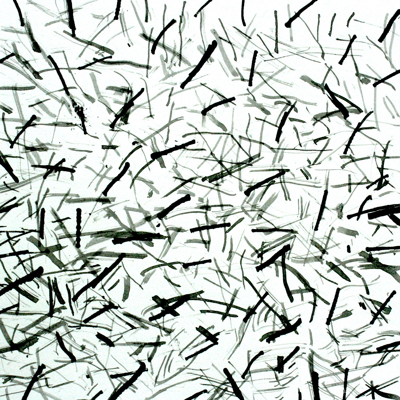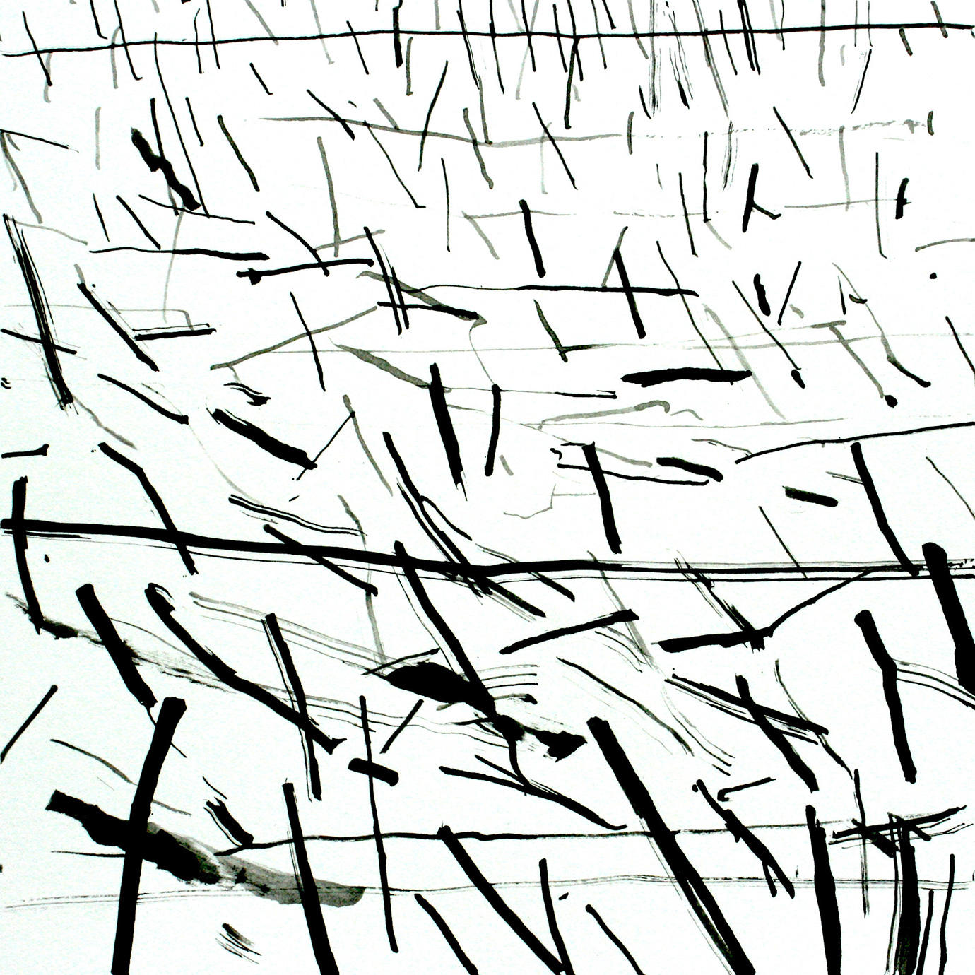 These are marks on paper that mirror the marks on the landscape made by humankind, and by movement; in turn, they reveal traces left by that landscape on the mind of the artist. Furthermore, each mark is also the result of the impact of art thereupon, as Parsons was reminded on these revelatory walks by the cut stalks of Van Gogh’s reed pen drawings. This led to his making such pens of his own, from bamboo, and in the works exhibited we chart a path of pens made from canes cut in to fine pen shapes, to ones created simply by breaking the canes in two, dipping them without hesitation in to ink