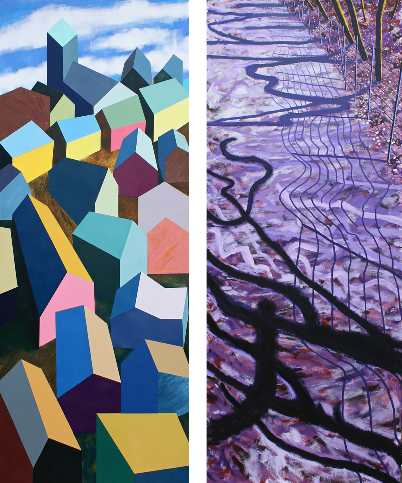 David Parsons, Houses on the Hill (2015), Oil on Canvas, 165cm x 65cm / David Parsons, Broadwalk (2014/5), Oil on Canvas, 200cm x 80cm