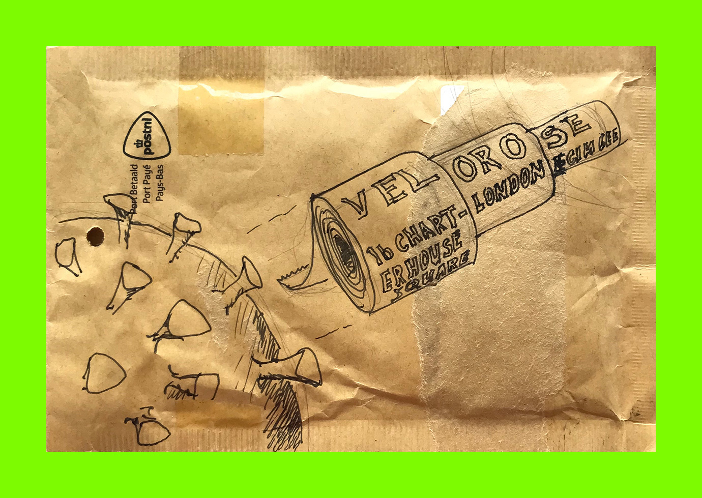 Rafe Bertram, Untitled (Toilet-Roll as Antidote to the Virus) (Postcard Sent to Velorose from London, 2020), Ink on Padded Envelope (Unique) (Not for Sale)