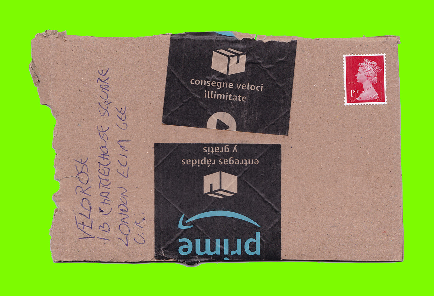 Stephen Wrench, Untitled (Prime Consignment) (Postcard Sent to Velorose from Brighton, 2020), Printed Adhesive Tape on Corrugated Card, as Found (Unique) (Not for Sale)