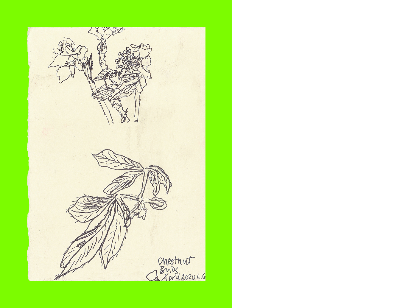 L. G., Chestnut Buds (Postcard Sent to Velorose from London, 2020), Ink on Card (Unique) (Not for Sale)