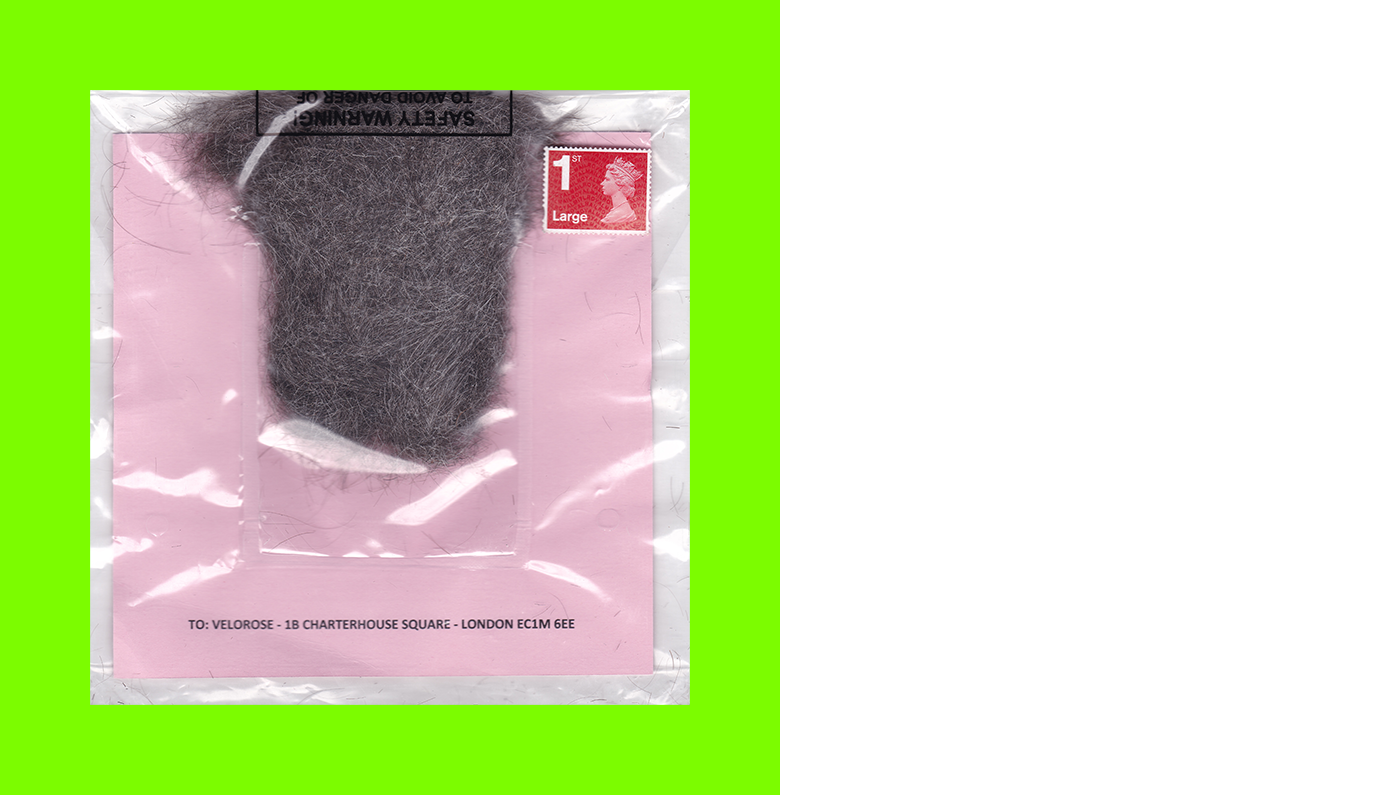 Jan Petroschka, Untitled (The Barber Paradox) (Postcard Sent to Velorose from London, 2020), Male Head and Facial Hair and Printed Card in Plastic Pouch as Found (Unique) (Not for Sale)
