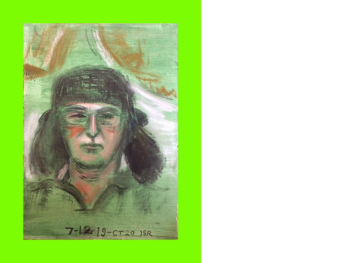 Daniel Miller, 7-12 19-CT20 ISR (Self-Portrait) (Postcard Sent to Velorose from Folkestone, 2020), Pastel, Ink and Watercolour on Card on Printed Paper (Unique) (Not for Sale)
