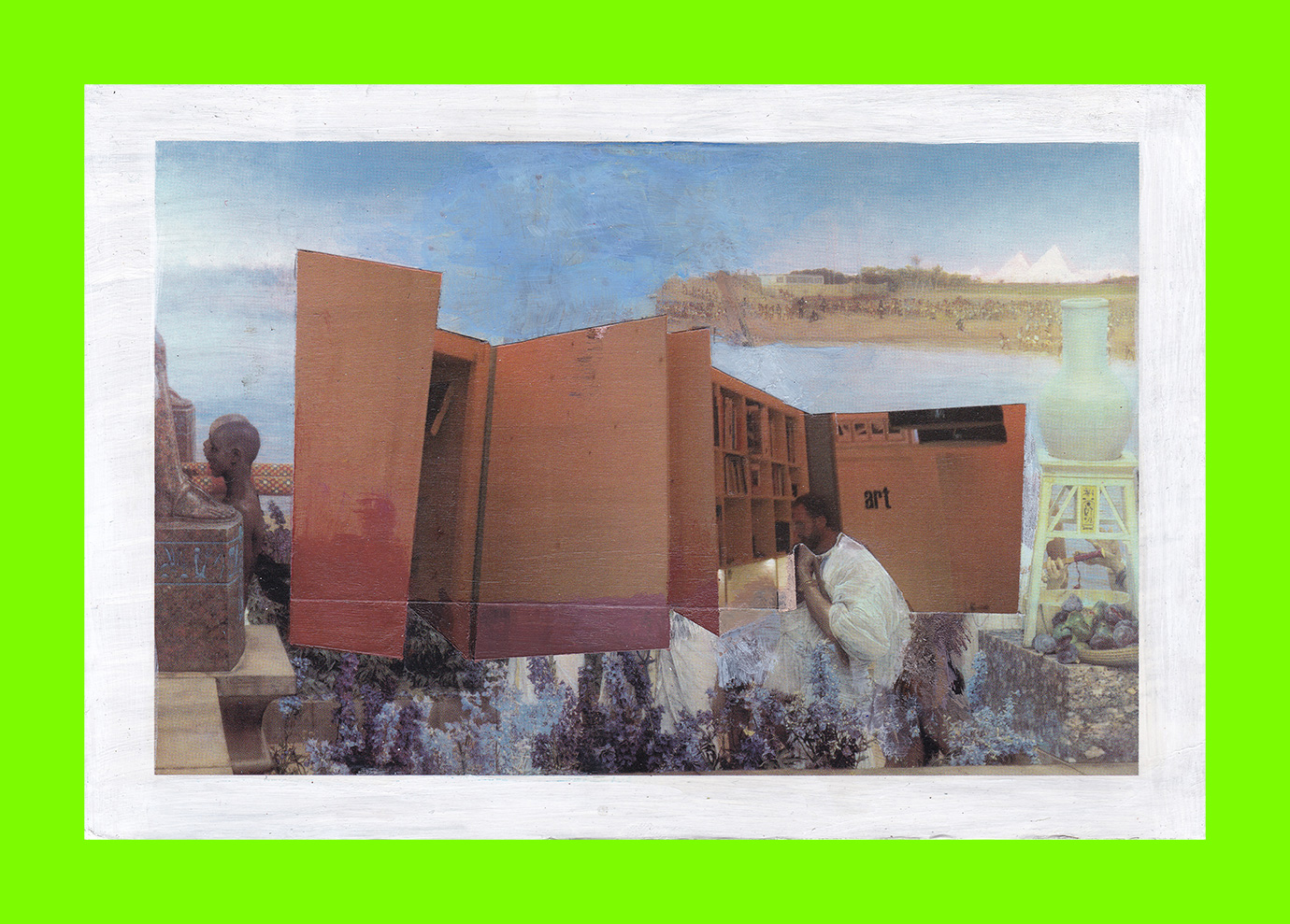 Gail Seres-Woolfson, Velorose in Biblical Times (Referencing Lawrence Alma-Tadema ’The Finding of Moses’ (1904)) (Postcard Sent to Velorose from London, 2020), Paint and Collaged Photograph on Postcard (Unique) (Not for Sale)