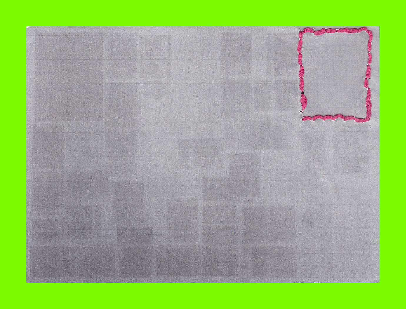 (Velo)Rosie McCrum, Accidental Cyanotype (Postcard Sent to Velorose from London, 2020), Thread on Printed Paper on Polycarbonate (Unique) (Not for Sale)