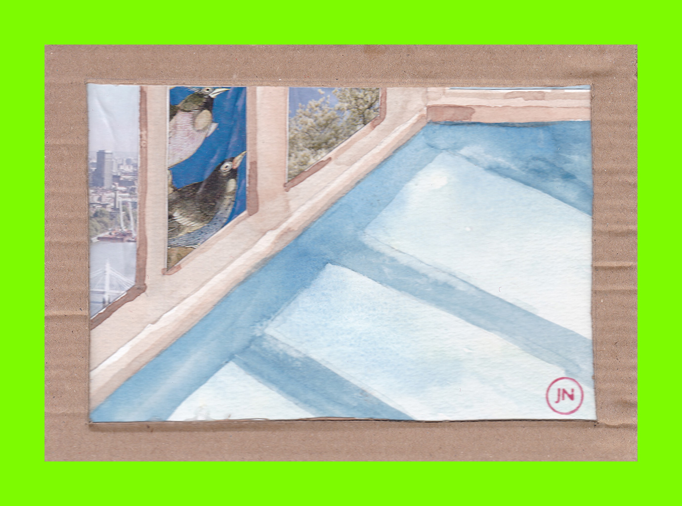 Jane Northcote, Light / Space (Postcard Sent to Velorose from London, 2020), Watercolour Paint on Watercolour Paper, Cut and Collaged with Magazine Pages and with Corrugated Card Frame (Unique) (Not for Sale)