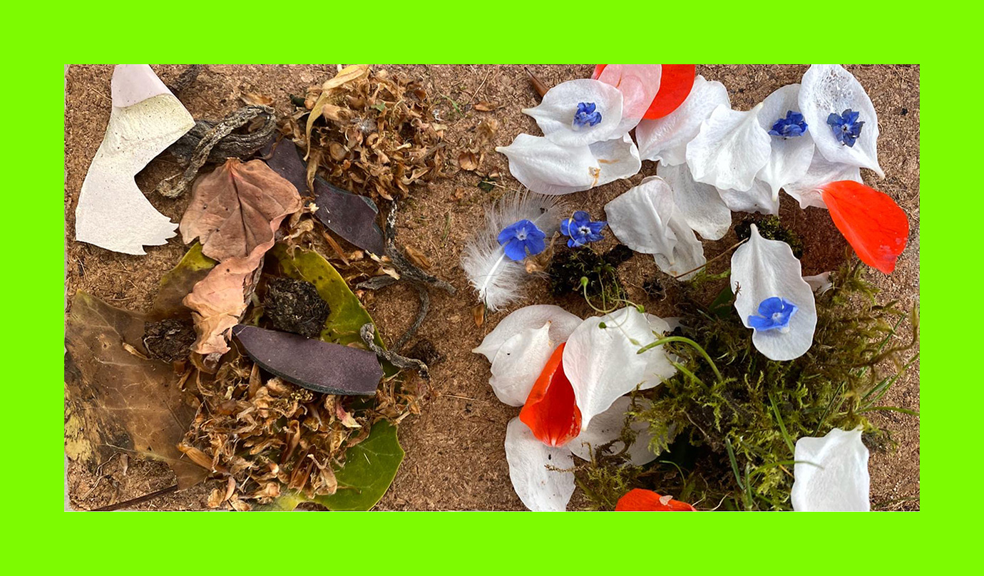 Kerry McKinnon, Covid-19 Before and After (Postcard Sent to Velorose from London, 2020), Found Flora and Detritus on Bee Mat Seed Carpet (Unique) (Not for Sale)