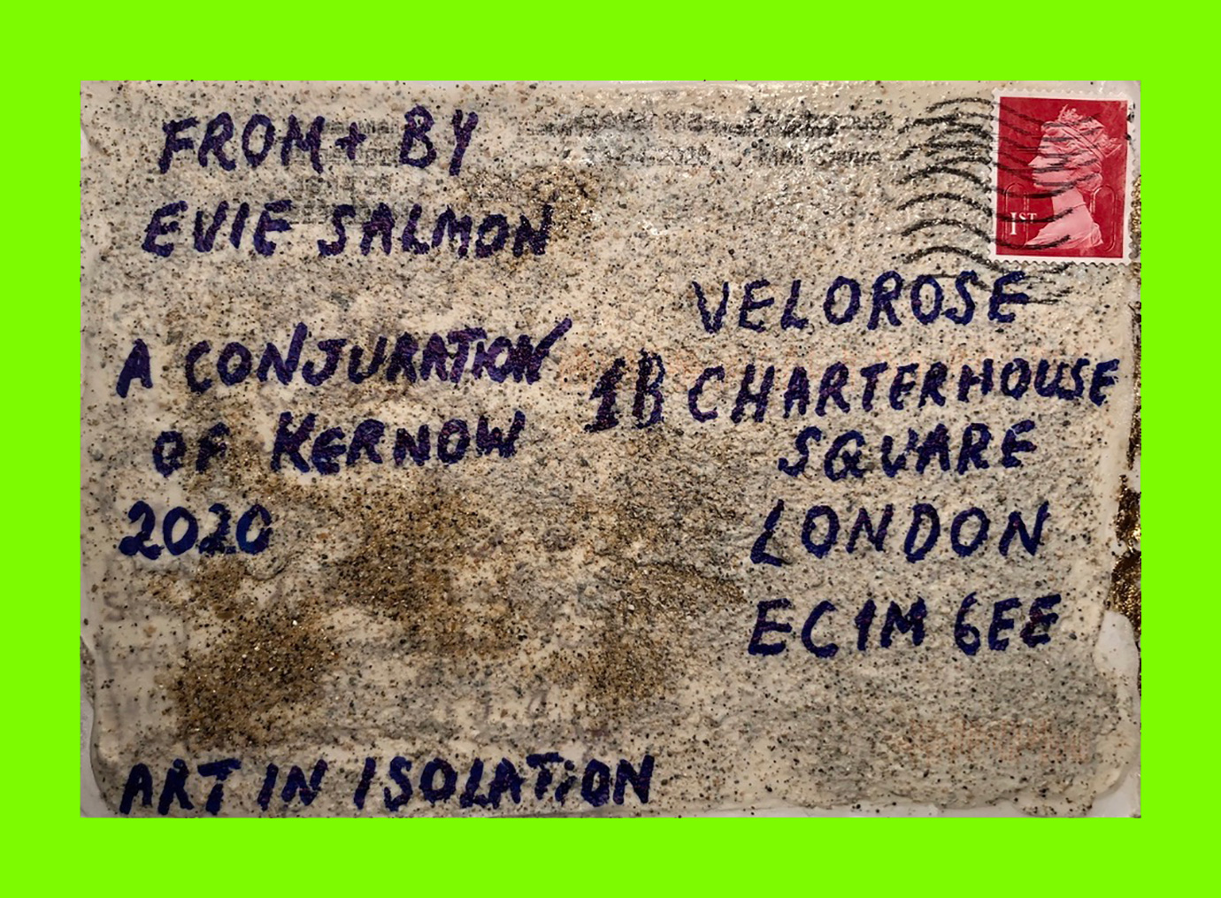 Evie Salmon, A Conjuration of Kernow (Art in Isolation) (Postcard Sent to Velorose from Cambridge, 2020), Gold Leaf, Sea Water, Sand and Ink on Cornish Postcard (Reverse) (Unique) (Not for Sale)