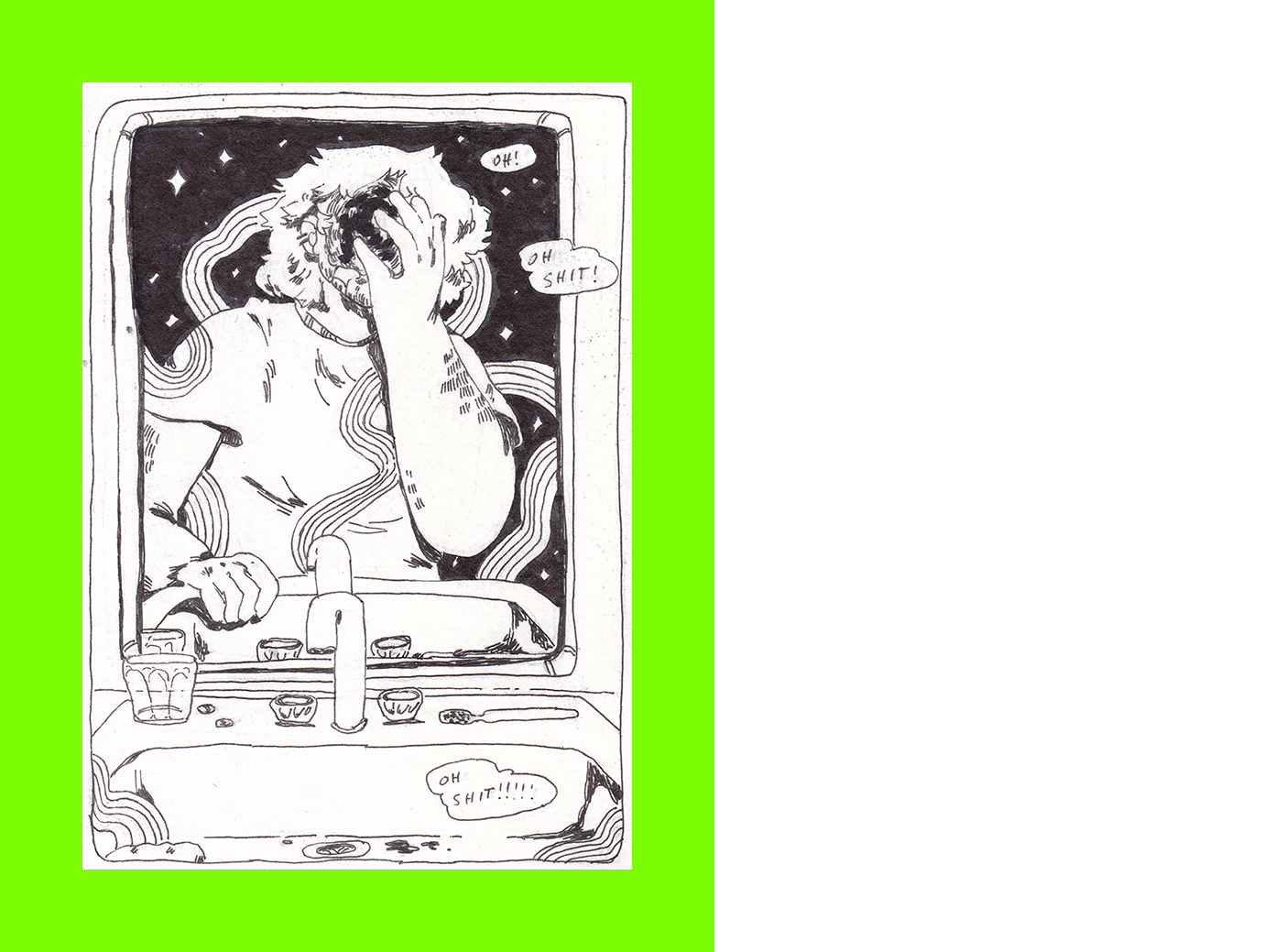 Ellis Bertram, ’Oh Shit’: Scene from a Graphic Novel I Haven’t Written Yet (Postcard Sent to Velorose from London, 2020), Ink on Watercolour Postcard (Unique) (Not for Sale)