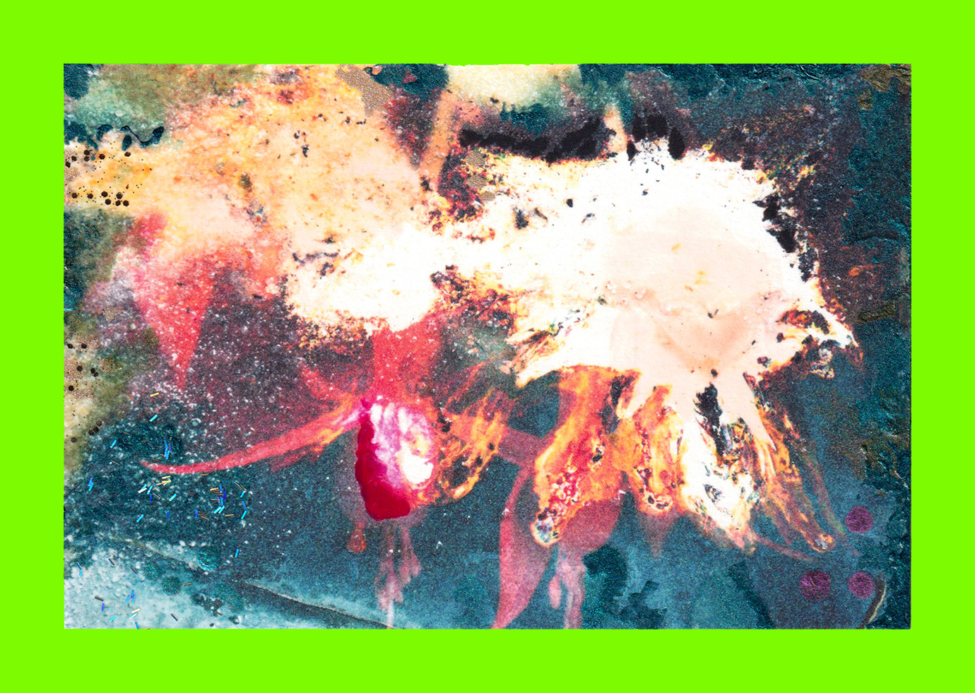 Pippa Brabyn, Fuchsia (Postcard Sent to Velorose from London, 2020), Nail Varnish on Photograph of Photograph Treated with Water and Bleach (Reverse) (Unique) (Not for Sale)