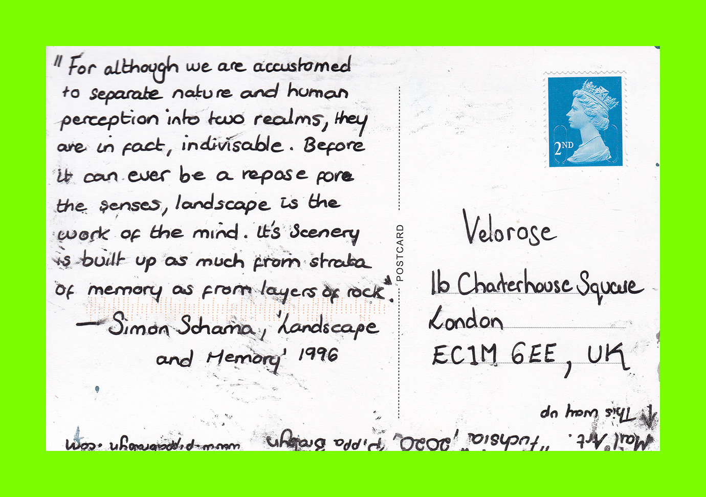 Alma Tischlerwood, Don’t Forget Nature (Postcard Sent to Velorose from London, 2020), Rubber-Stamped Ink on Printed Photograph on Card (Unique) (Not for Sale)