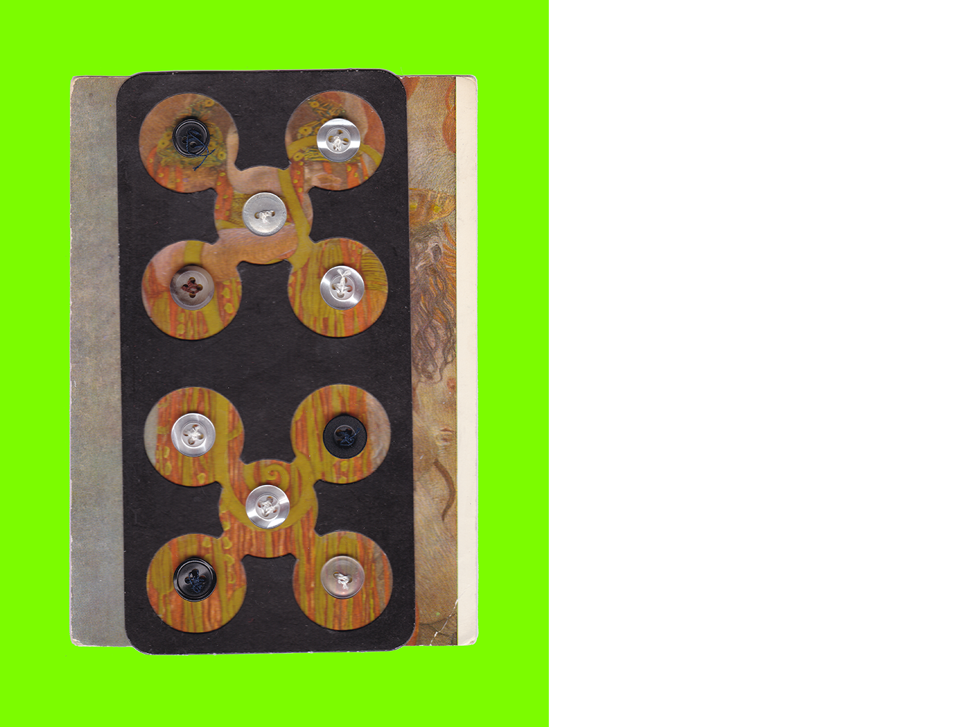 Matthias Spiess, Happy Birthday Hygieia! (3 Times) (Postcard Sent to Velorose from London, 2020), Die-Cut Card and Buttons Glued and Sewn on to Gustav Klimt Postcard (Medizin, Destroyed 1945) (Unique) (Not for Sale)