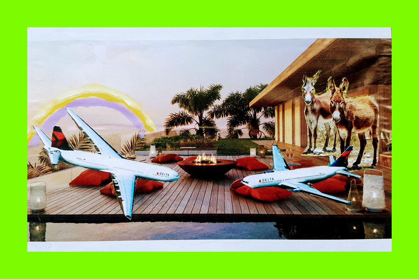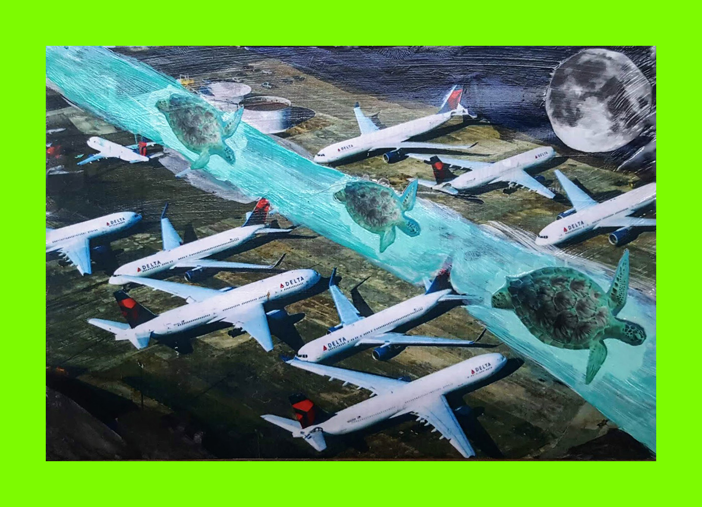 Marion Flanagan, When the Airplanes are Grounded (Postcard Sent to Velorose from London, 2020), Acrylic Paint and Collage on Pizza Box (Unique) (Not for Sale)