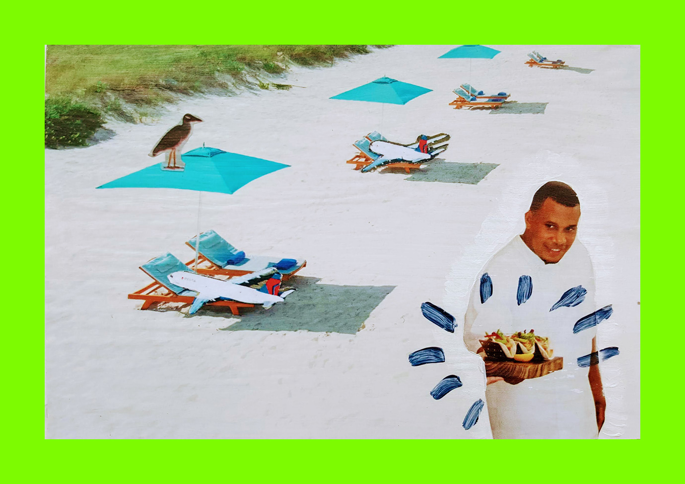 Marion Flanagan, Taking a Break II (Postcard Sent to Velorose from London, 2020), Acrylic Paint and Collage on Pizza Box (Unique) (Not for Sale)