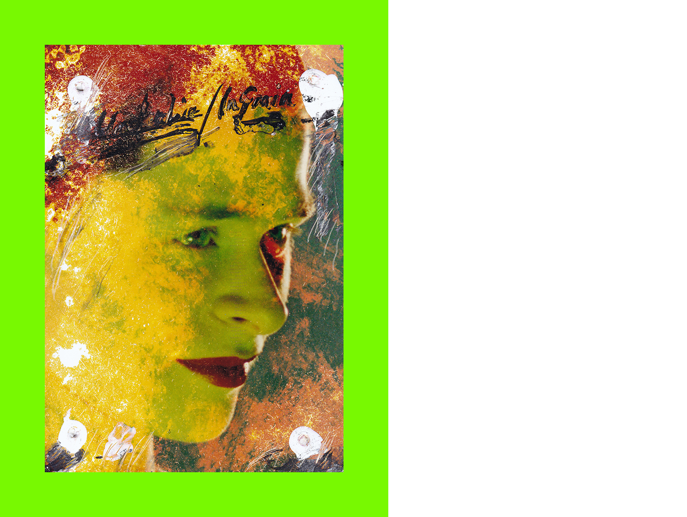 Marc Atkins, Underlie / In Grain, (Postcard Sent to Velorose from Berkshire, 2020), Paint, Tippex, Scratchmarks, Book Paper and Masking Tape on Photograph with Nail Holes (Reverse) (Unique) (Not for Sale)