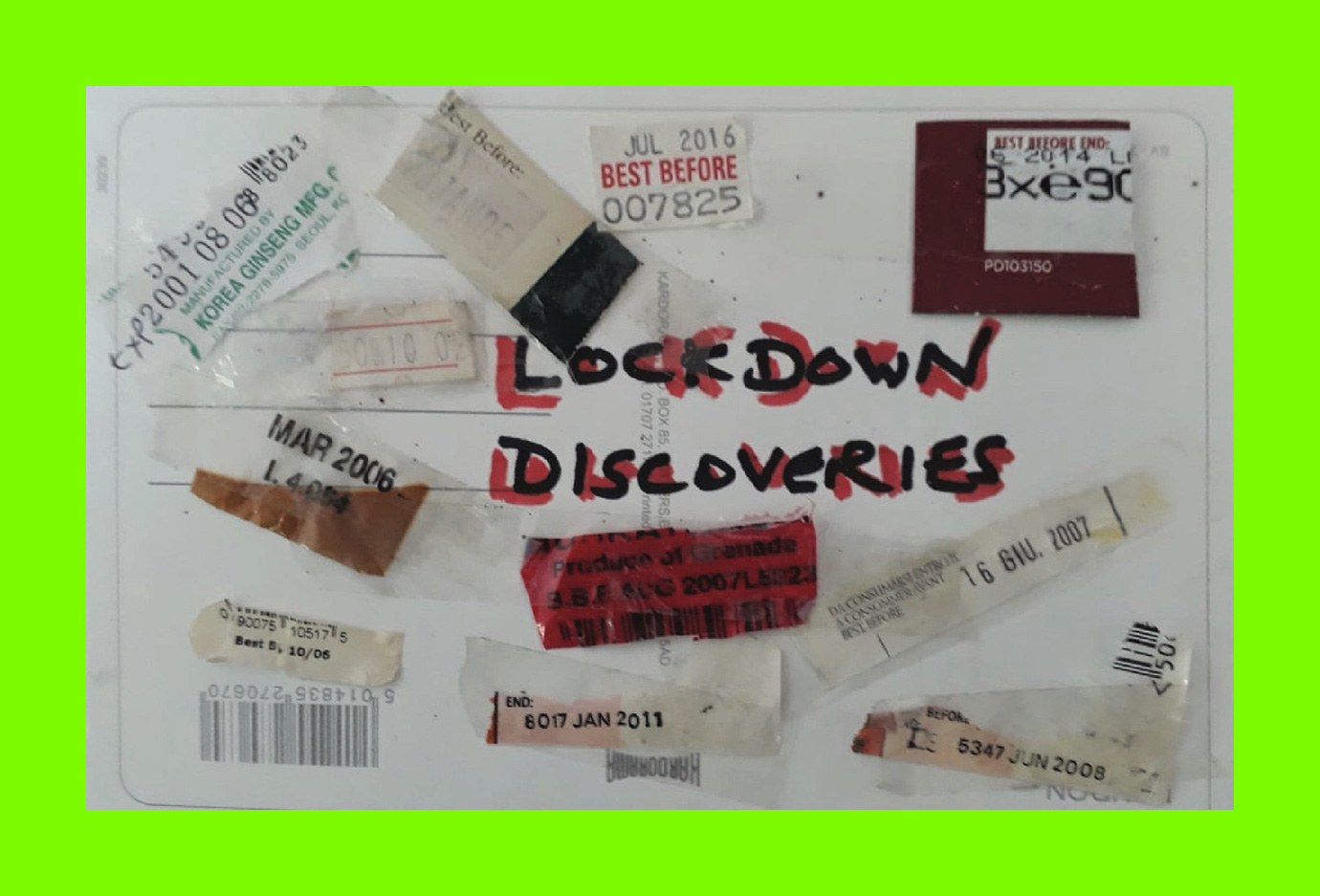 Nicola Delahunty, Lockdown Discoveries (Postcard Sent to Velorose from London, 2020), ‘Best Before’ Spice and Herb Labels and Ink on Found Postcard (Unique) (Not for Sale)