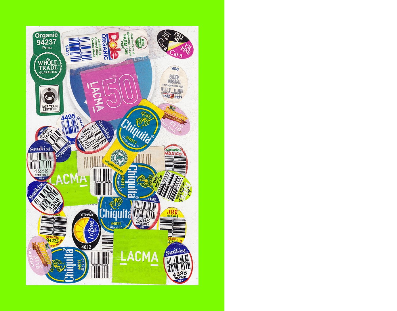 Valerie McClean, Untitled (Peel Me I’m Pink) (Postcard Sent to Velorose from Manchester, 2020), Fruit Stickers on Found Postcard (Unique) (Not for Sale)
