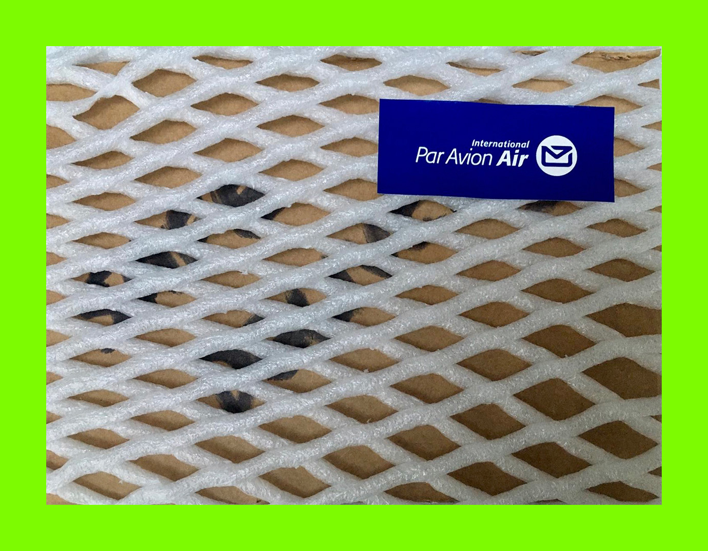 Ann Boland, Safe Delivery (Postcard Sent to Velorose from Wellington, 2020), Expanded Polystyrene Mesh with Adhesive Label and Found Ink on Corrugated Card (Unique) (Not for Sale)