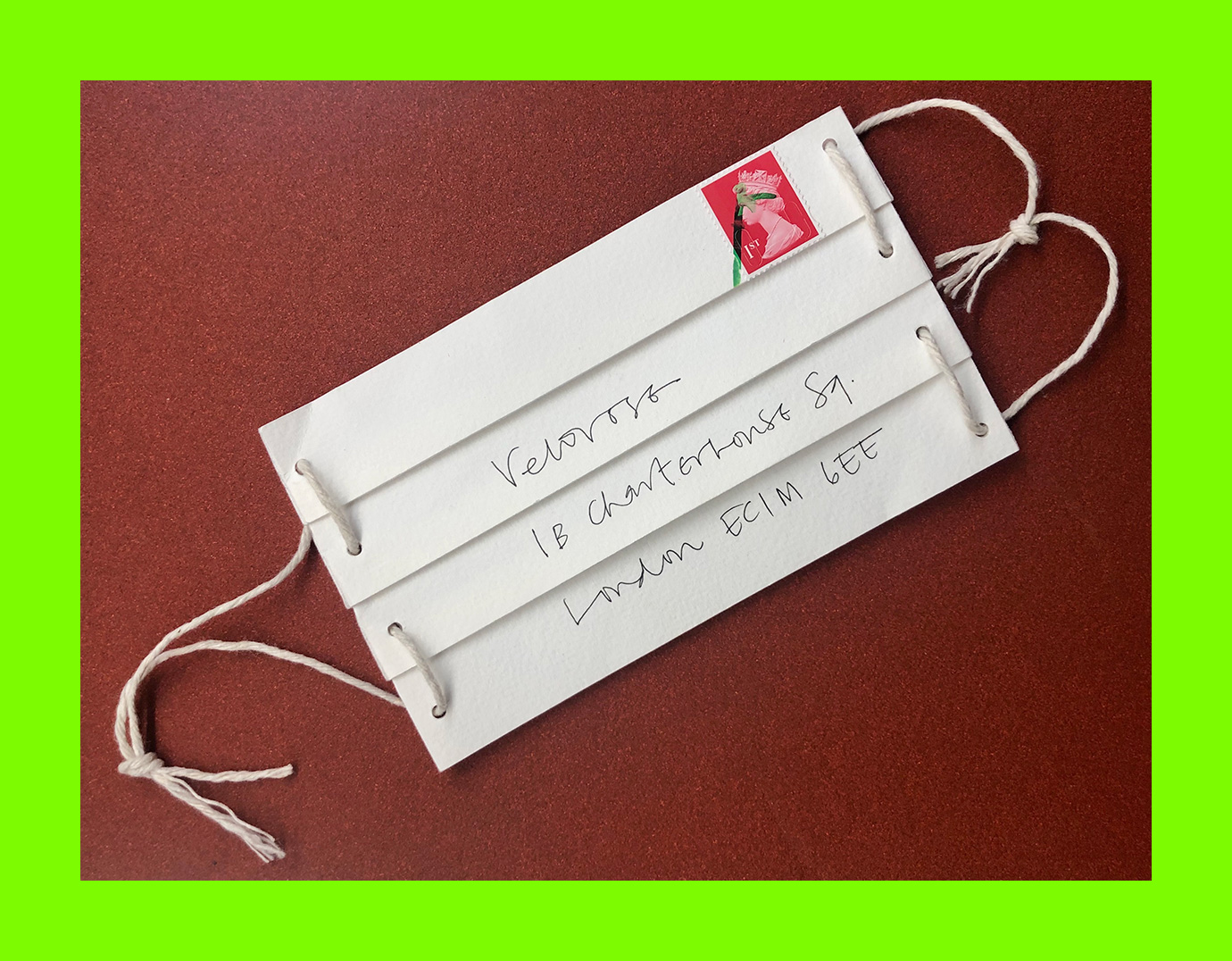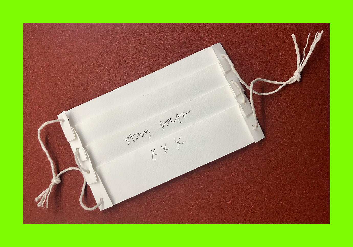 Dr Sophie Carter, Stay Safe (Postmask / Maskard) (Postcard Sent to Velorose from London, 2020), Ink and String on Perforated and Folded Watercolour Paper (Obverse) (Unique) (Not for Sale)