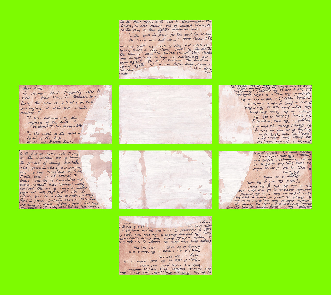 Sue Goldschmidt, Dear Earth Octaptypch (Eight Postcards Sent to Velorose from London, 2020), Porcelain, Ink and Watercolour Paint on Found Postcards (Unique) (Not for Sale)