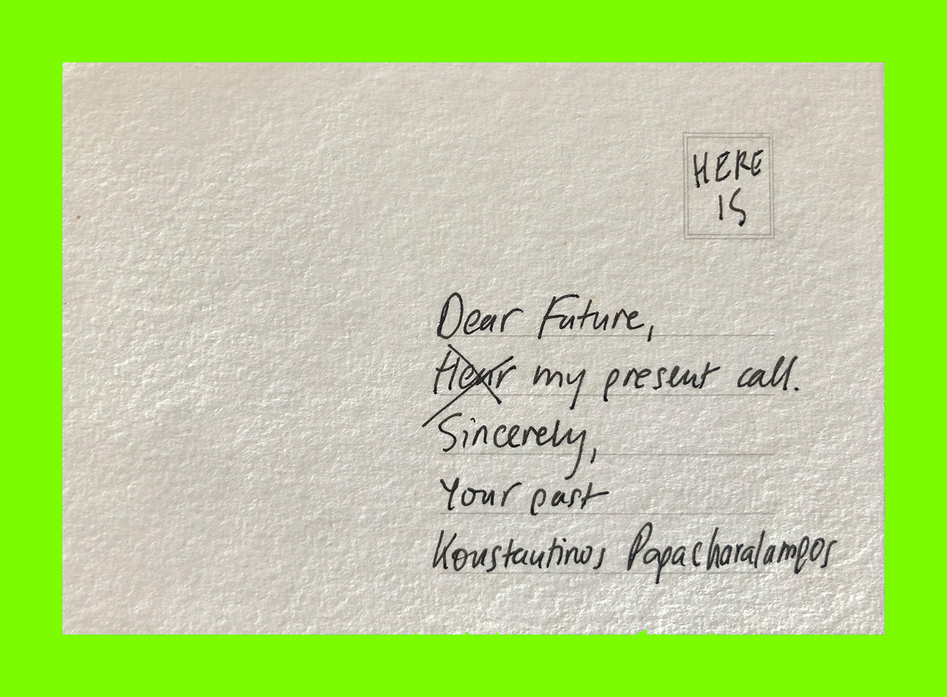 Konstantinos Papacharalampos, Untitled (Dear Future) (Postcard Sent to Velorose from London, 2017), Ink on Card, 103mm x 147mm (Unique) (Not for Sale)
