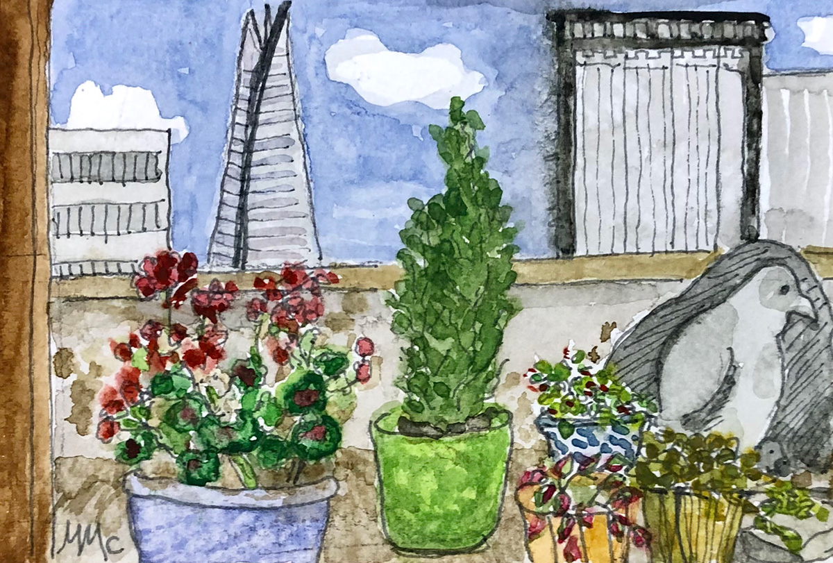 Miranda McArthur, View from the Tower (My Window on the World) (Postcard Sent to Velorose from London, 2020), Watercolour Paint and Felt Tip Pen on Cass Art 300gsm Watercolour Postcard (Unique) (Not for Sale)