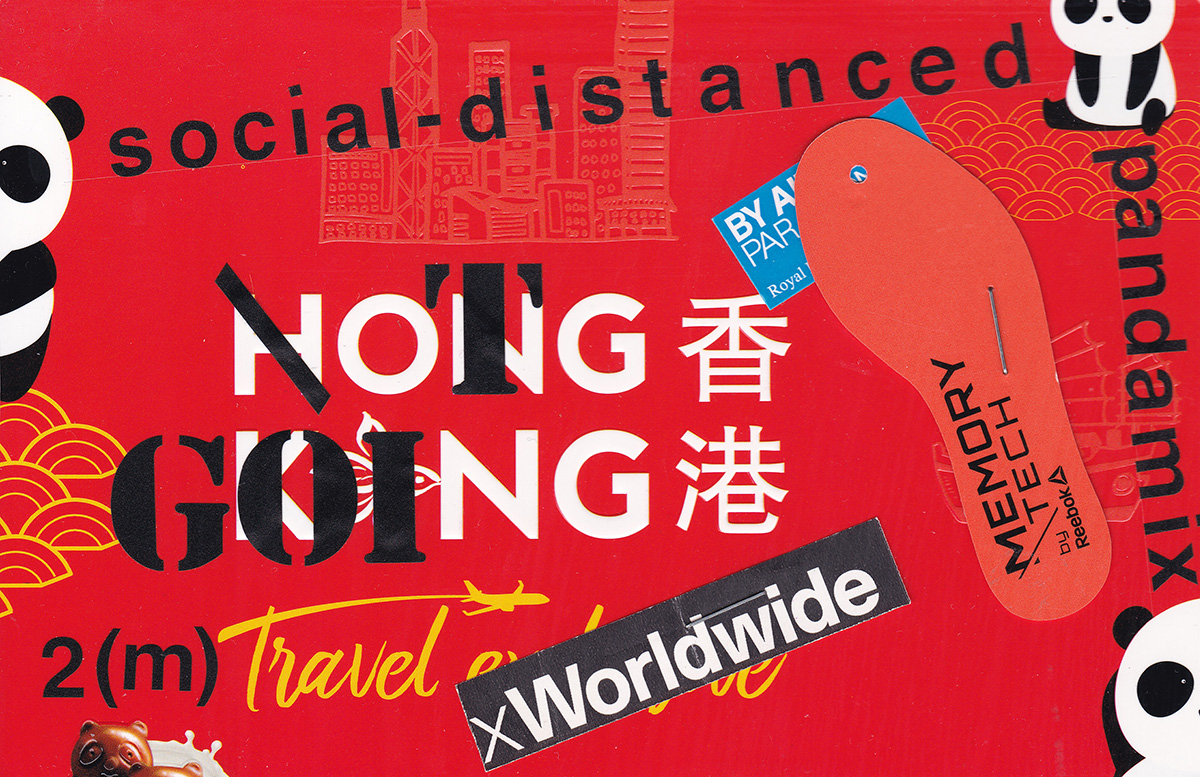 Dan Pemic, Not Going 2(m) Travel xWorldwide (Postcard Sent to Velorose from London, 2020), Vinyl, Adhesive / Clothes Labels and Staples on Chocolate Box Card (Unique) (Not for Sale)
