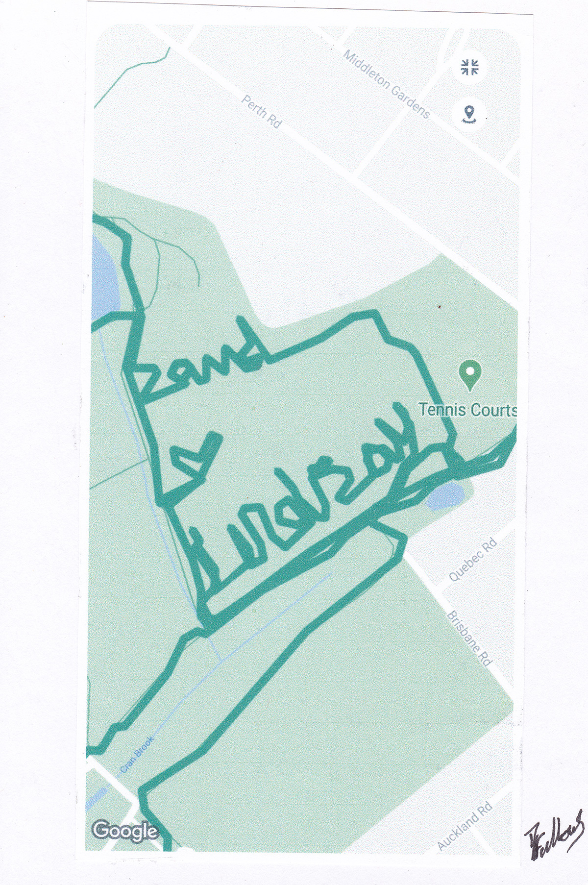 David Fallows, David ♥ Lindsay (Postcard Sent to Velorose from Ilford, 2020), Print-Out of StepTracker Route on Google Maps Showing Portion of 6.5 Mile Walk (12,146 Steps) at 06:24h on 03.06.20 on Card (Unique) (Not for Sale)