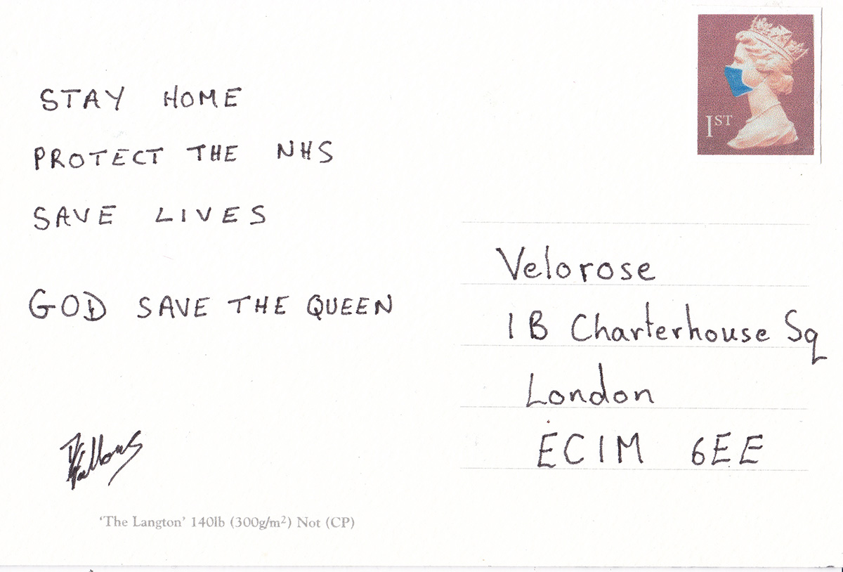 Daisy de Villeneuve, Stay Home, 'Stay Safe, Be Kind' (Postcard Sent to Velorose from London, 2020) Felt Pen on Paper (Unique) (Not for Sale)