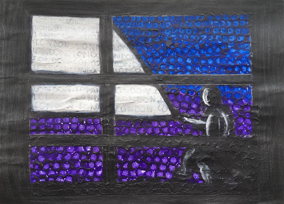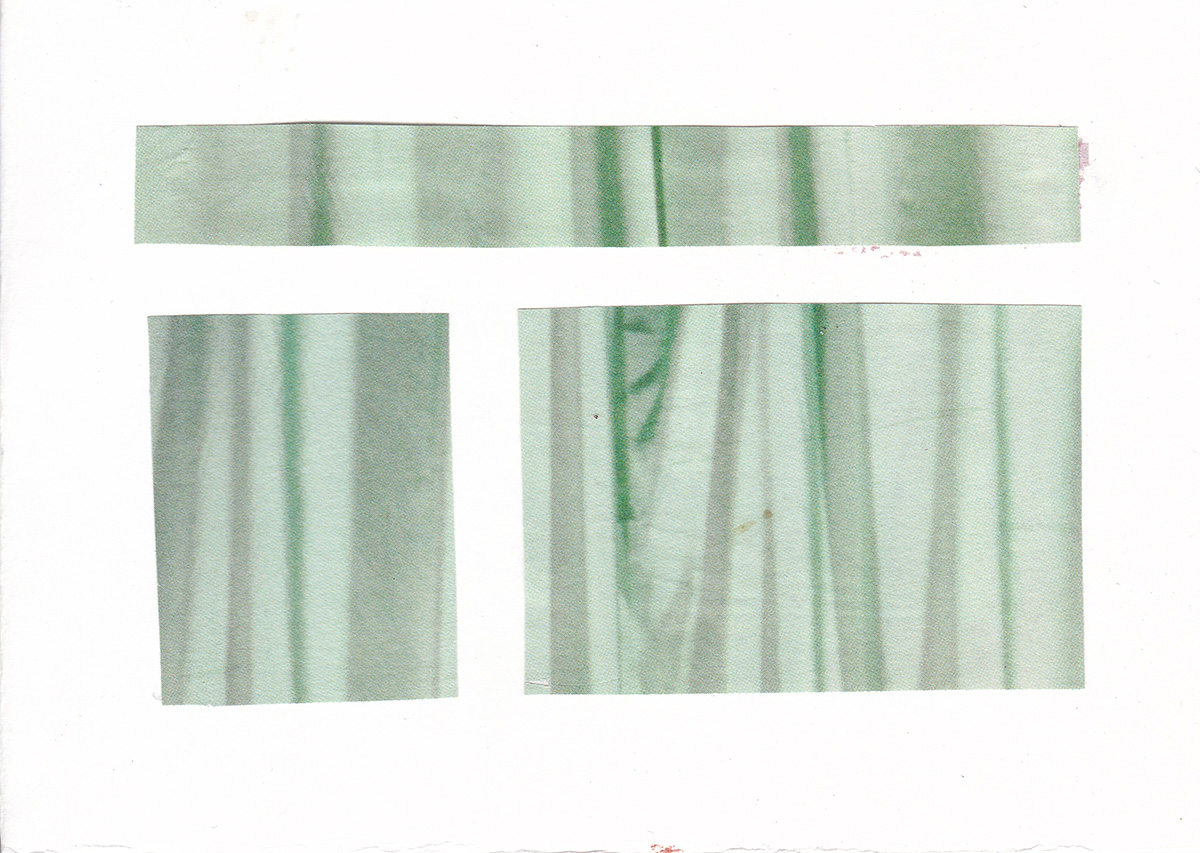 Anna Gibb, Isolation Escapes (Inside Looking Out) (Postcard Sent to Velorose from London, 2020), Collage of Artist’s Damaged Edition Prints on Card (Unique) (Not for Sale)