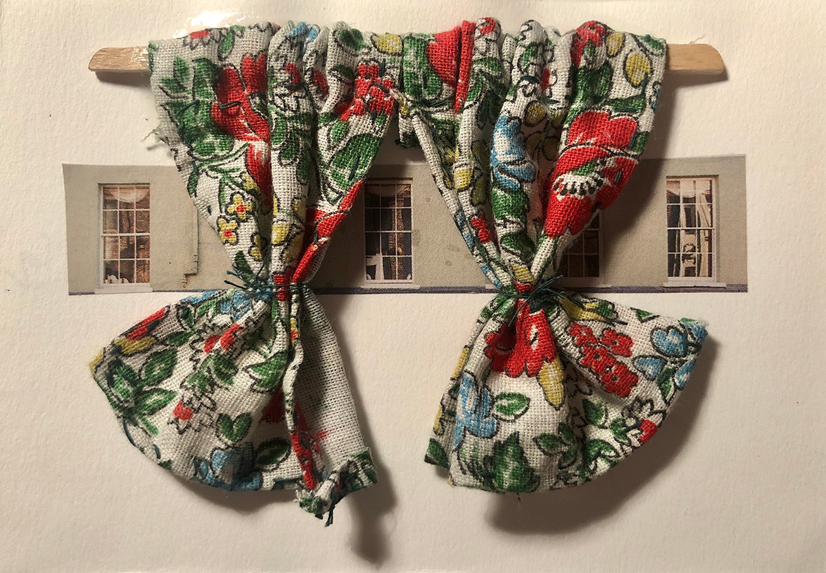 Melissa Green, Collage Chintz (Postcard Sent to Velorose from London, 2020), Printed Cotton with Thread, Lolly Stick and Magazine Page on Paper (Unique) (Not for Sale)