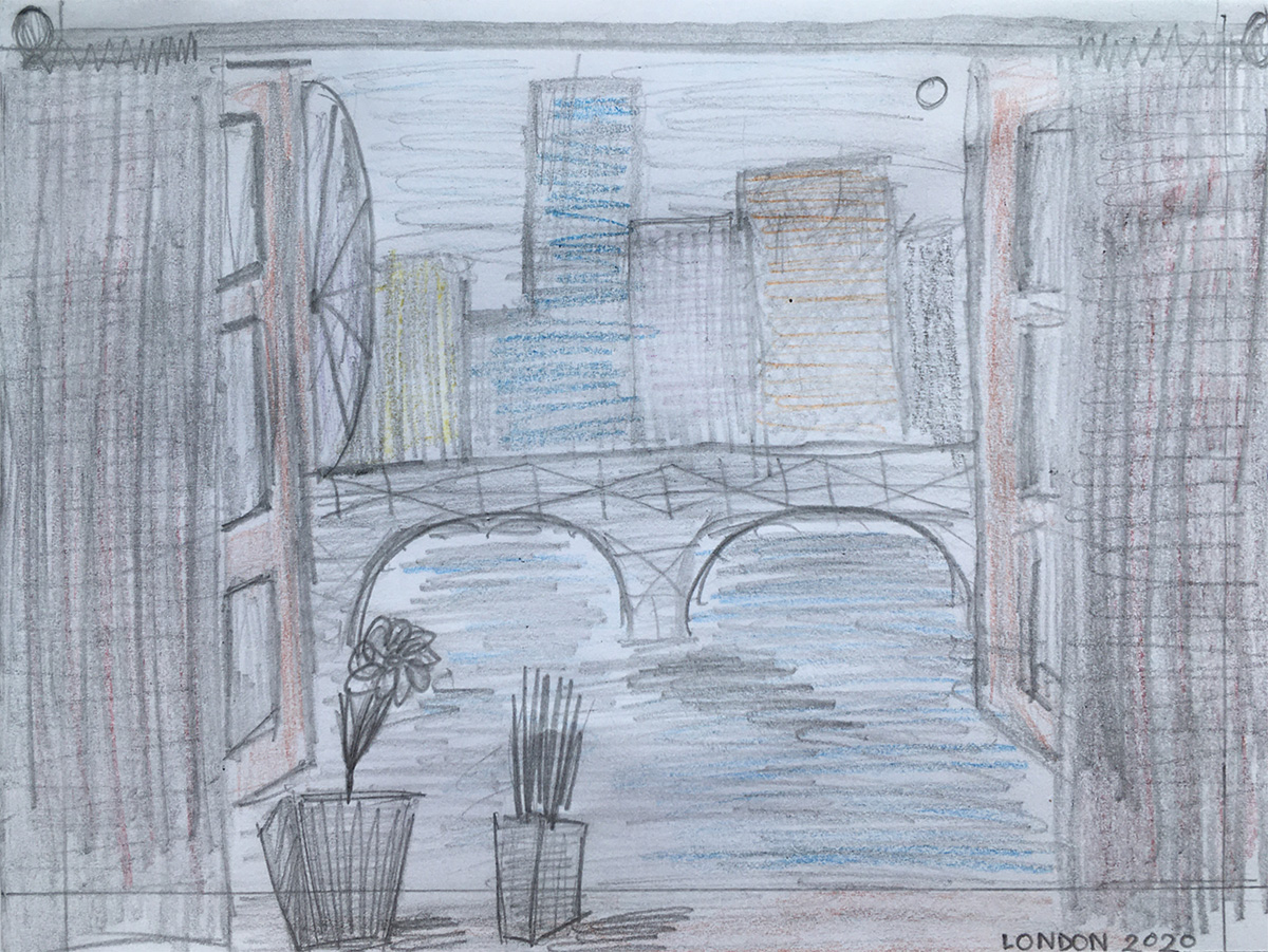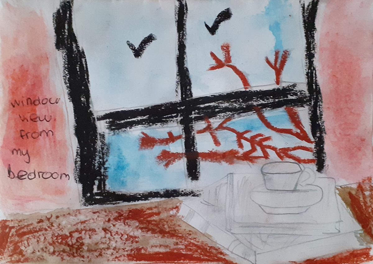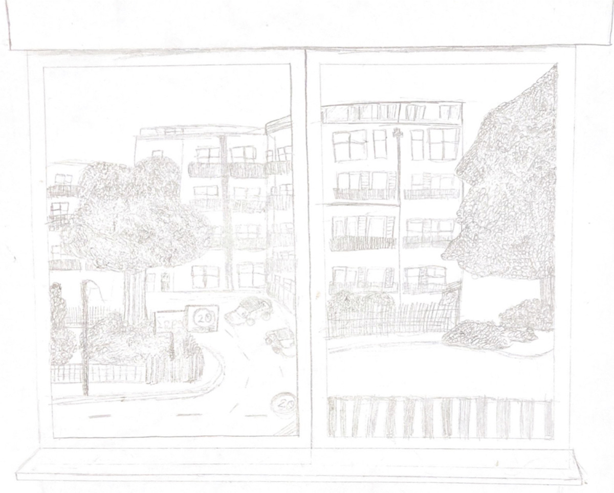 Anugayathri (Year 9, Green School for Girls), Window View from My Bedroom (Postcard Sent to Velorose from London, 2020) Pencil and Pastel (Unique) (Not for Sale)