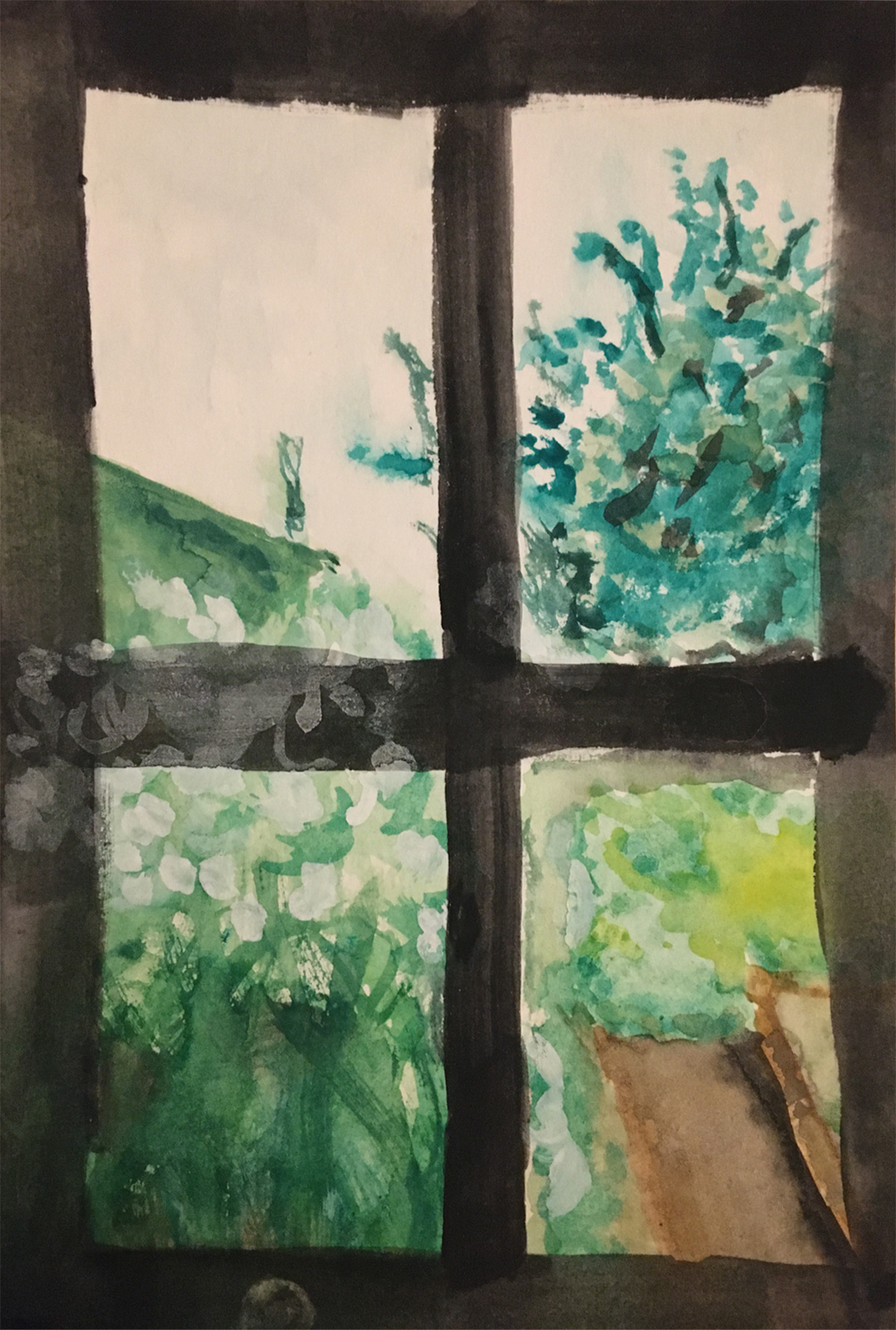 Ameilia (Year 8, Green School for Girls), Untitled (Black Frame, Green View) (Postcard Sent to Velorose from London, 2020) Watercolour Paint (Unique) (Not for Sale)