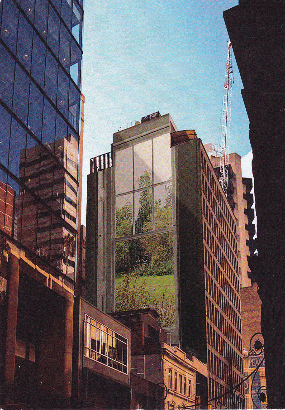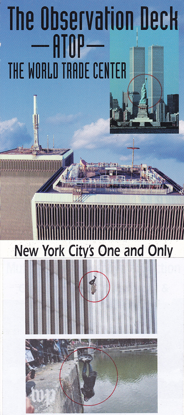 The Fallen Man, Windows on the World (Postcard Sent to Velorose from London, 2020), Vintage Flyer, Print-Out and Stamp (Cancelled) on Card (Obverse) (Unique) (Not for Sale)