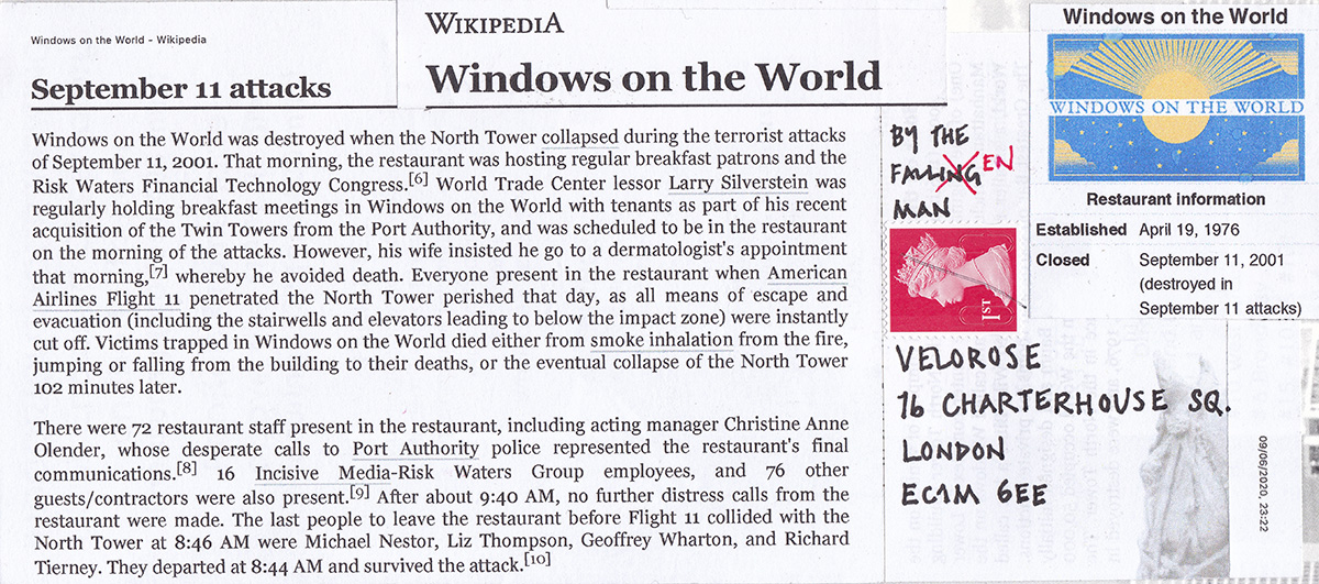 The Fallen Man, Windows on the World (Postcard Sent to Velorose from London, 2020), Vintage Flyer, Print-Out and Stamp (Cancelled) on Card (Reverse) (Unique) (Not for Sale)