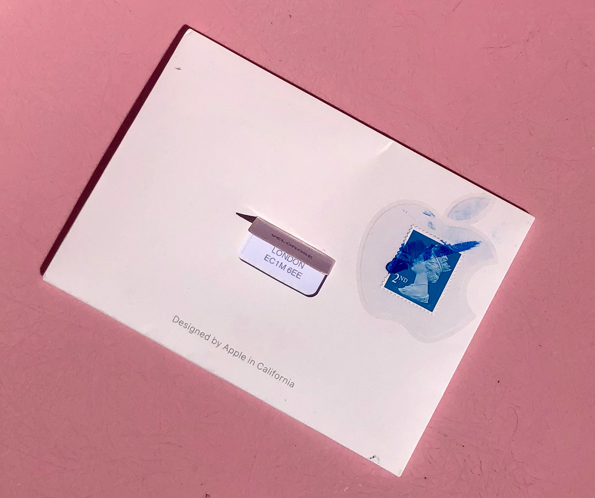 Anonymous, Untitled (White Window) (Postcard Sent to Velorose from London, 2020) Print on Paper with Adhesive Label on Apple Packaging, Stamp and Felt Pen Cancellation (Unique) (Not for Sale)