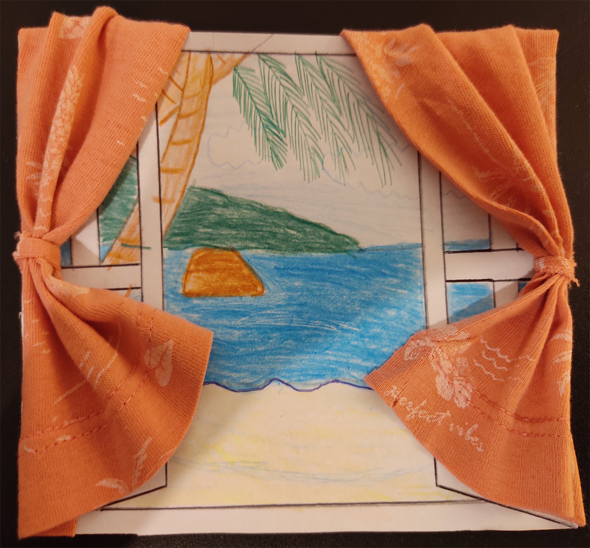 Mahima (Year 9, Green School for Girls), Untitled (Orange Curtains) (Postcard Sent to Velorose from London, 2020) Fabric and Coloured Pencil on Paper (Unique) (Not for Sale)