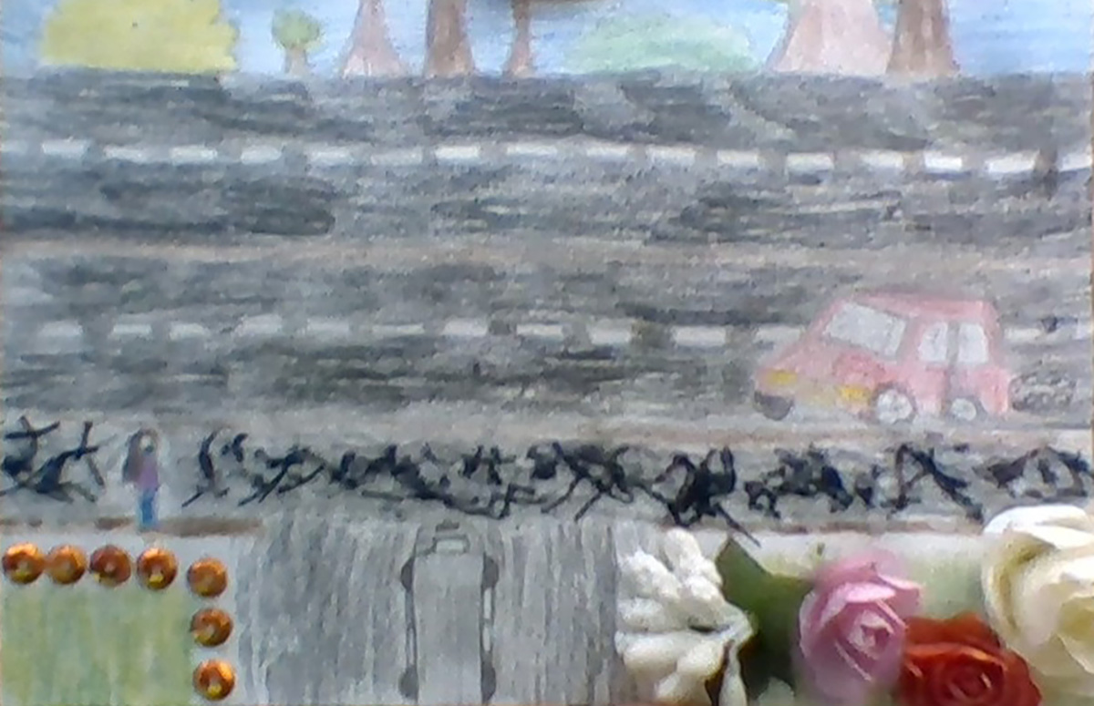Poppy (Year 8, Green School for Girls), Untitled (Tarmac and Grass) (Postcard Sent to Velorose from London, 2020) Fake Flowers, Sequins, Watercolour and Pencil on Paper (Unique) (Not for Sale)
