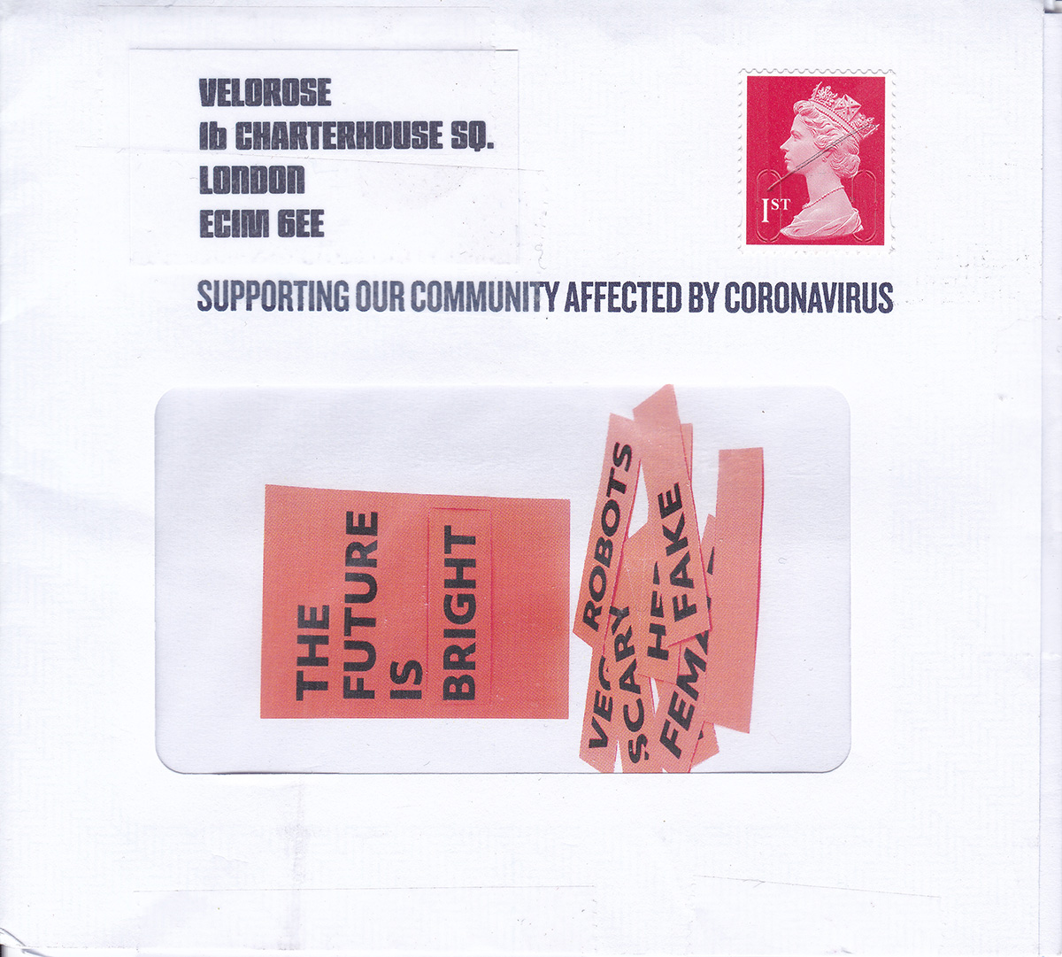 Anonymous, The Future is Bright (Coronavirus Hardshit) (Postcard Sent to Velorose from London, 2020) Collaged Recycled Envelope, Print-Outs and Stamp (Cancelled) (Obverse) (Unique) (Not for Sale)