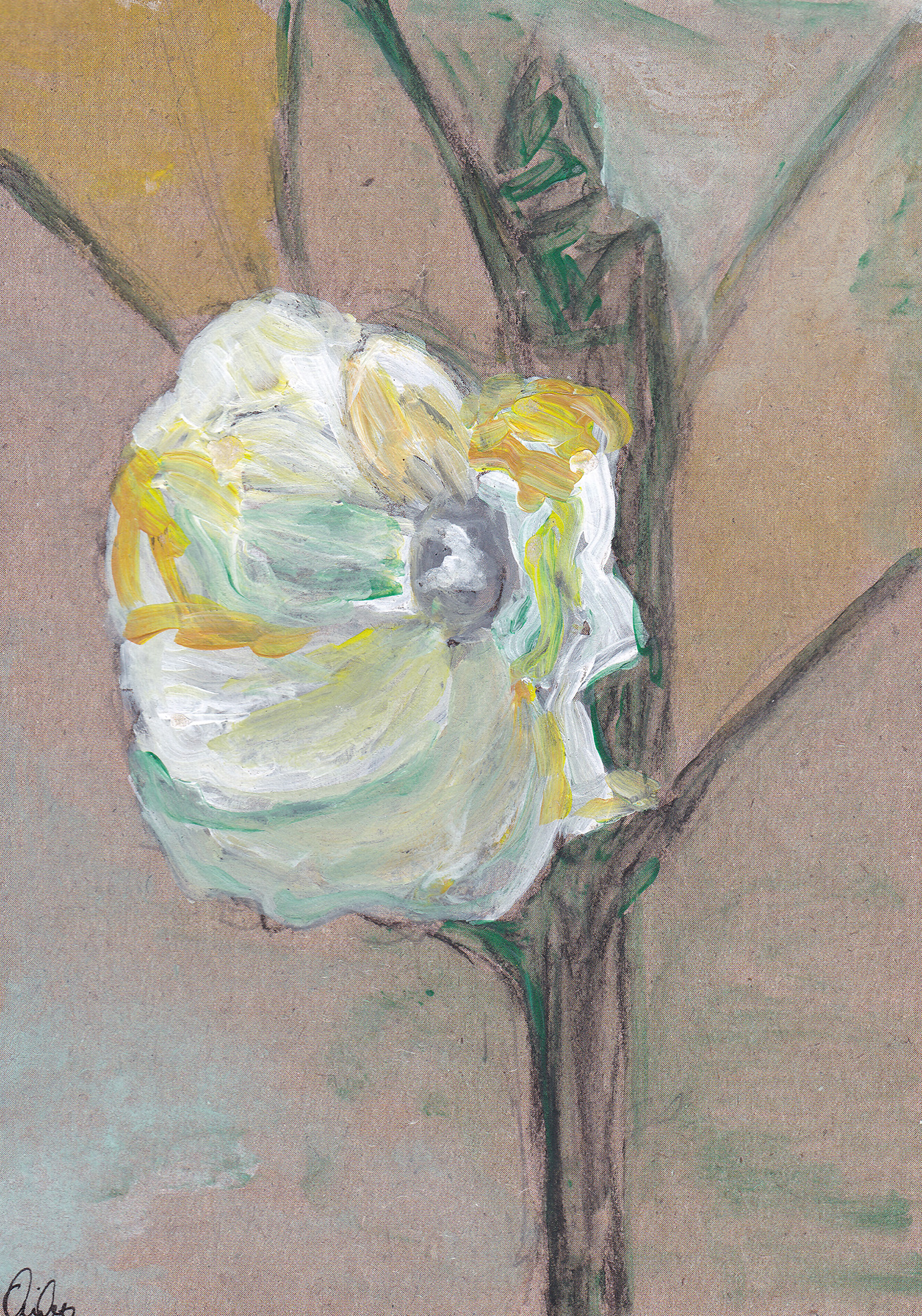 Chiko Makone, The Okra Flower (A Symbol of Resilience, Revolution and Home for the Slaves in Bonaire) Part 3 (2020) (Sent to Velorose 2020), Watercolour on Card, Unique, Not for Sale