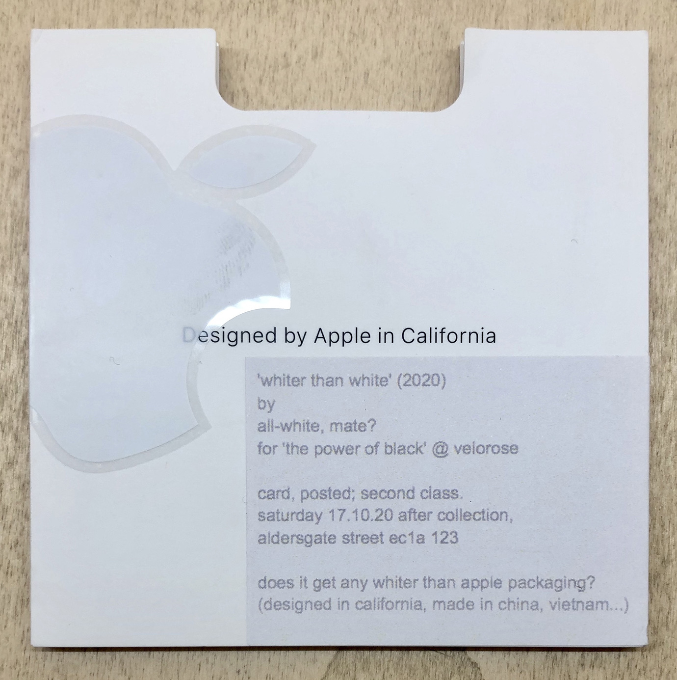 All-White, Mate?, Whiter Than White (Does it Get Any Whiter Than Apple Packaging?) (Sent to Velorose from London (Aldersgate EC1A 123) 17.10.20), Printed and Apple Adhesive Labels on Apple Card Sleeve, Unique, Not for Sale