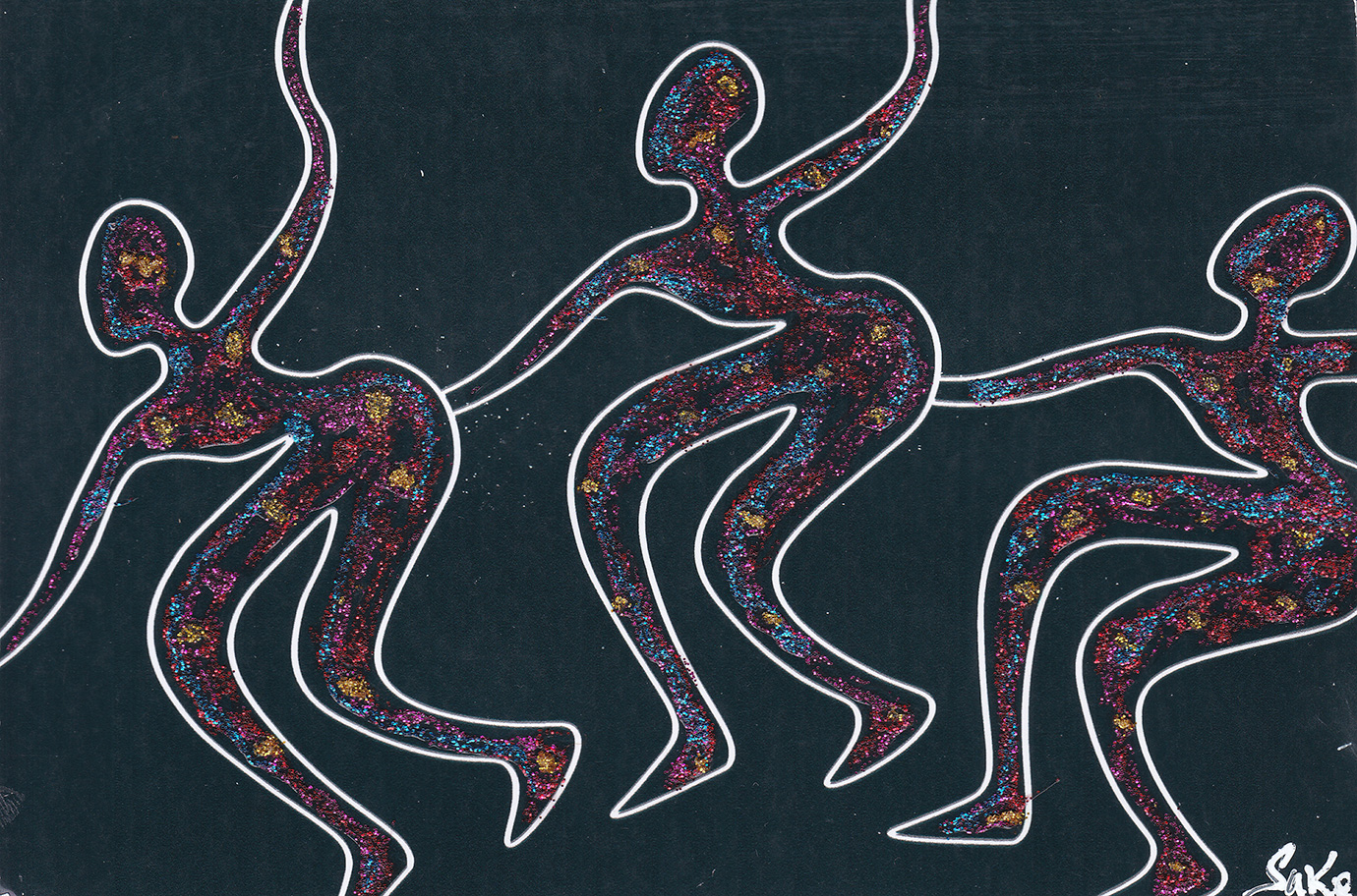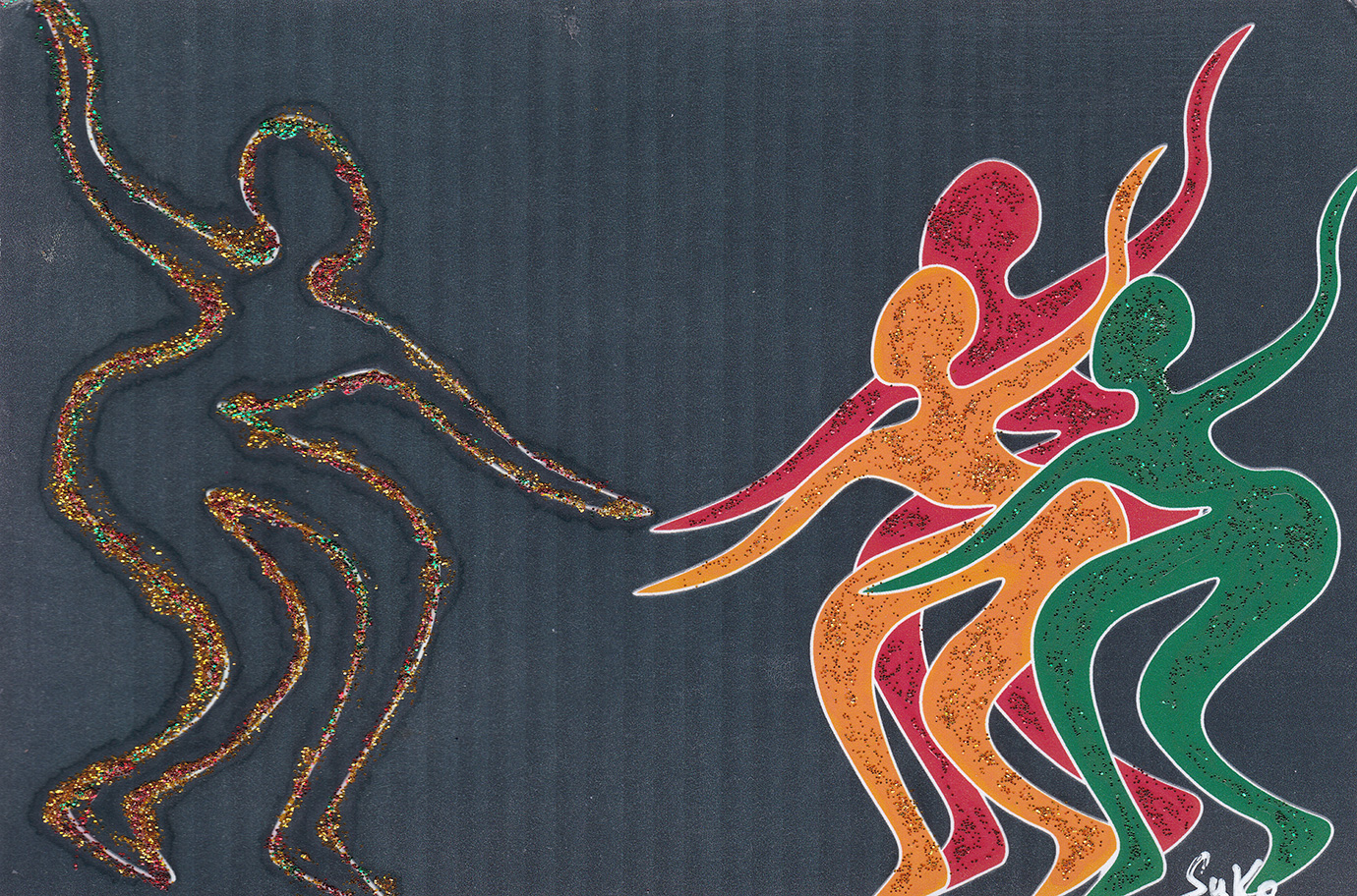 Suke Driver, Untitled (Red, Gold and Green Dance) (Sent to Velorose 2020), Glitter Pen on Printed Paper on Card, Unique, Not for Sale